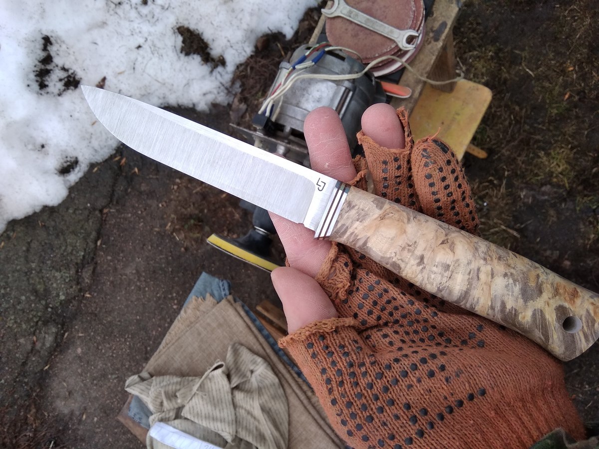 Доброго здравия, камрады. Попался мне в руки ушатаный советский кухонник с сточенным вкрай лезвием. Долго валялся в подвале,потом нашёлся клин заготовки под нож из 3Х13. Подогнал болгаркой,снял обжимное кольцо,почистил наждачкой и заворонил в машинном масле. Получился ,как по мне,прикольный антуражный мессер с закосом под финна С рукоятью ничего делать не стал, для пущего винтажа