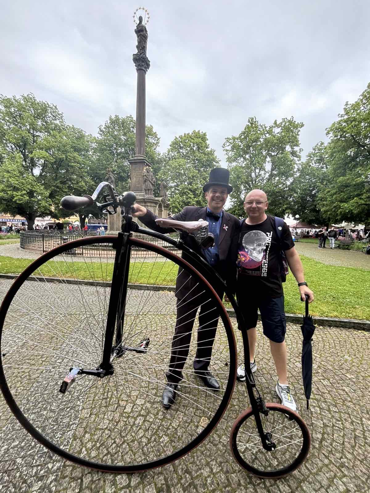 Не спитав,але особисто бачив як він їхав по дорозі на ньому.Ми приїхали до знайомого,на Івеко ювілей-130 років ну і в центрі міста історичні авто,автобуси різних часів і вело ..