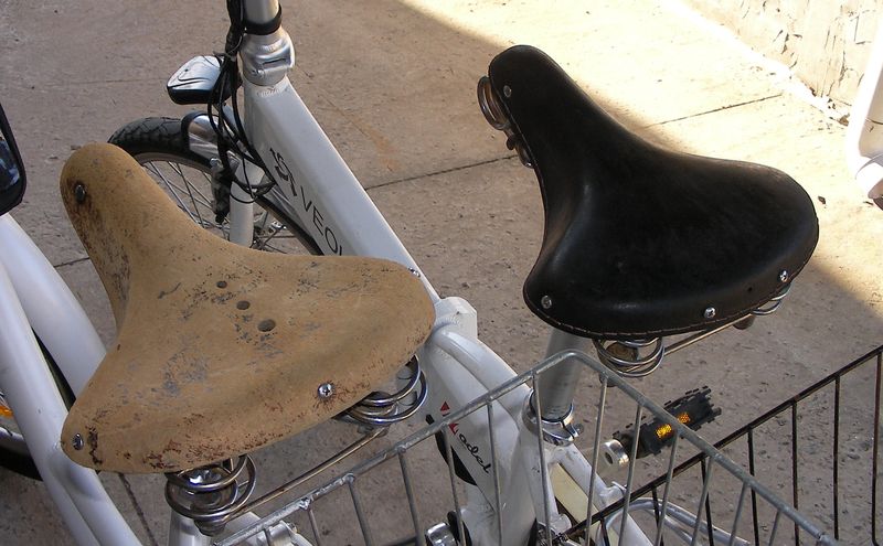 для сравнения, у брукса например, кожа примерно 5мм, нет никакого соединения между передней и задней частью именно под сиденьем, т.е. кожа под регулируемым натягом, ключ в комплекте для регулировки. Если проблемы с копчиком, а они не редки, подбирать посадку с бОльшим наклоном вперед и сиденье с канавой посредине, их есть, в том числе занедорого. Потому как тот же брукс начинается со ста с лишним евро и до двухсот. У многих вел одинаково стоит.Удастся найти хорошее еще совковое, вперед, но там пружины под кожей и возраст от 40 лет.