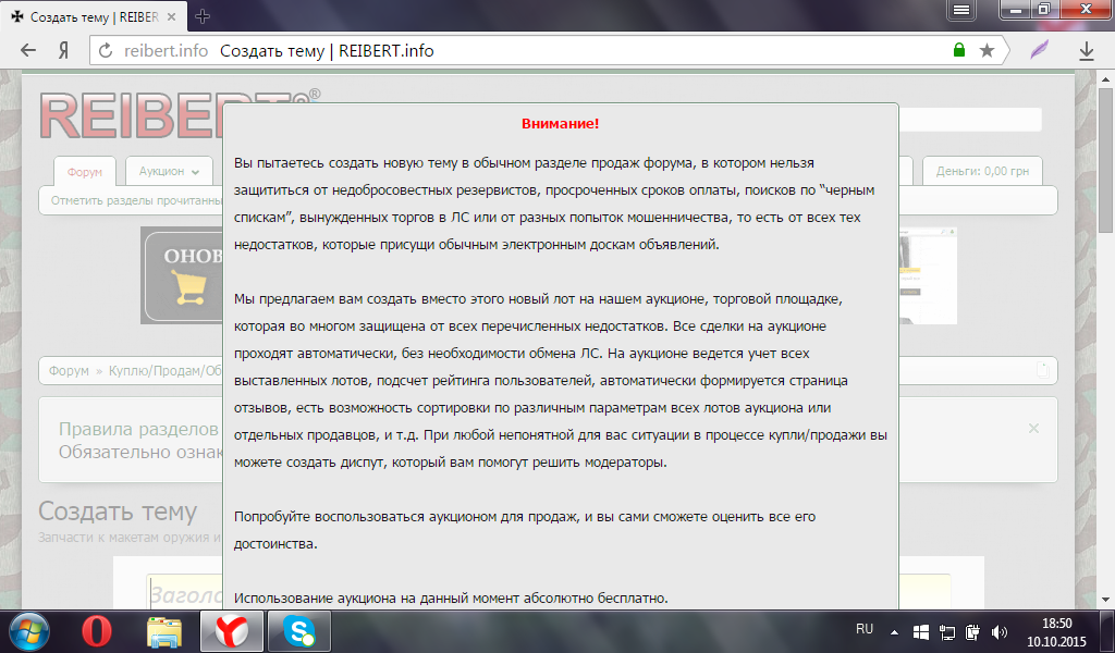 Добрый вечер! Извините, не знаю по теме ли я обращаюсь, но хочу как то изложить свою проблему: при попытке создать объявление в разделе запчасти и комплектующие, всплывает окно с информацией об аукционе и я не могу его никак обойти,чтобы создать тему. Объясните пожалуйста,как отключить это информационное окно? Зарание благодарен. С уважением.