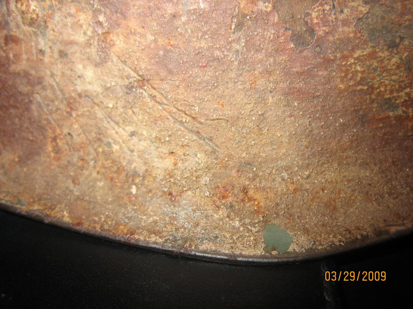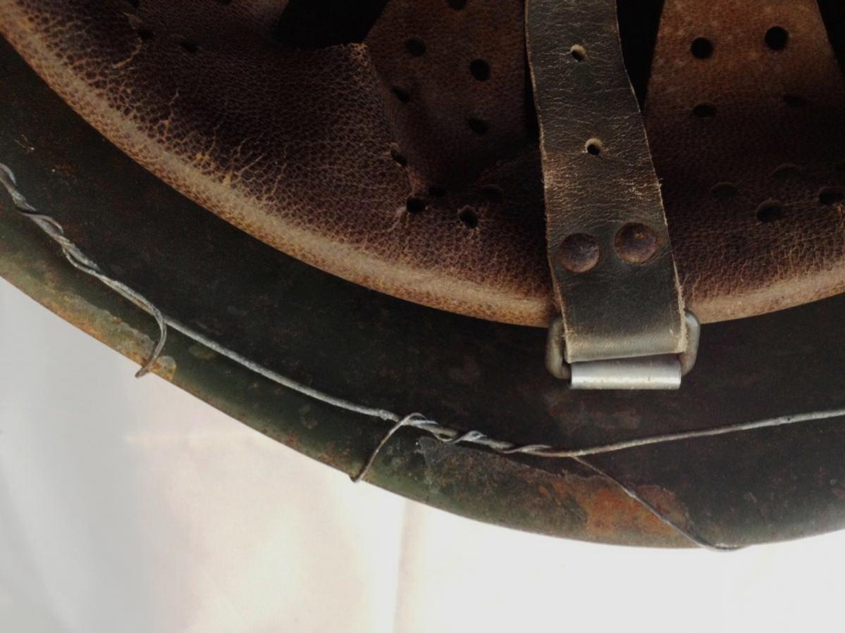 По всему судя этот шлем побывал в Испании во время гражданской войны и затем использовался уже в испанской армии. Приваривание крепежной скобы (для крепления кокарды используемой во время парадов) в лобной части шлема - это обычная практика характерная для многих моделей испанских шлемов, в этом случае видимо была применена и к "ностранцу"...
