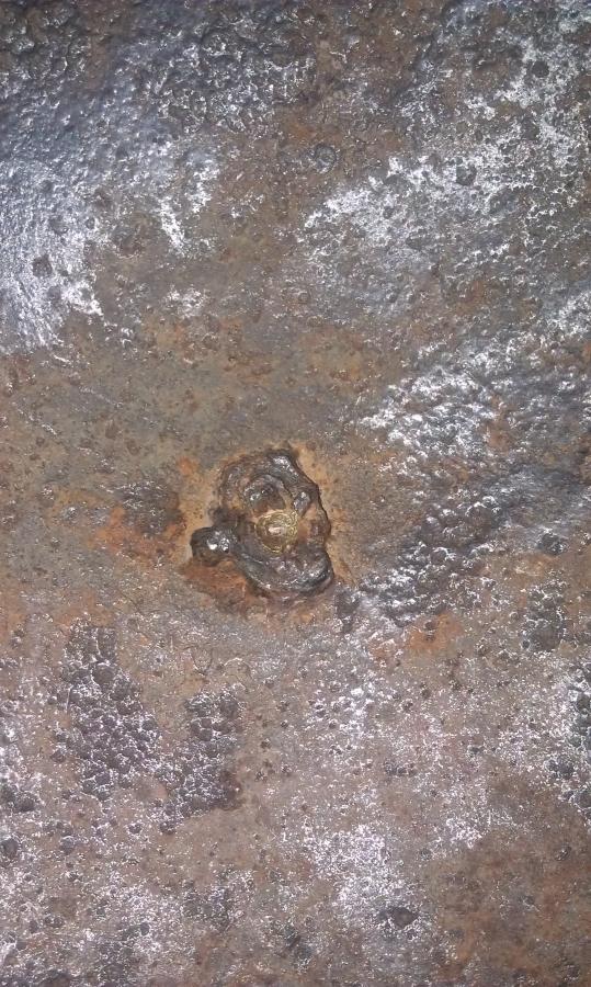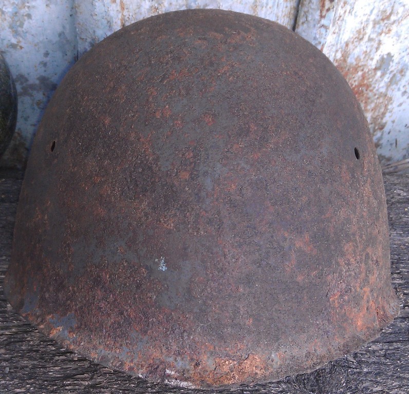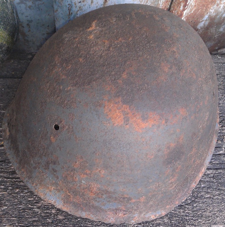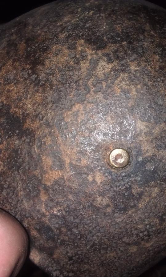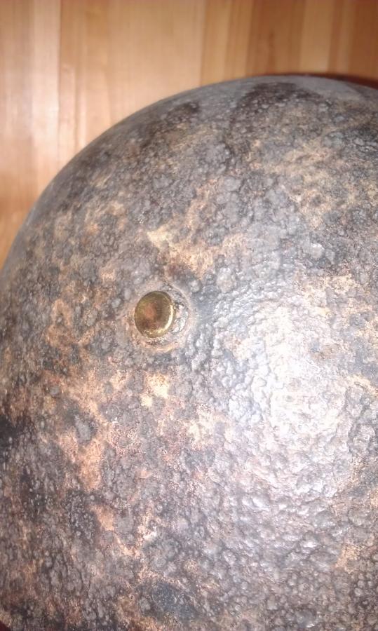 Мое мнение - латунная заклепка это "продукт" переделки М33 (попросту затычка) в какой нибудь сосуд-говночерпалку послевоенным мирным населением, случай весьма нередкий по отношению к шлемам врагов на территории СССР.