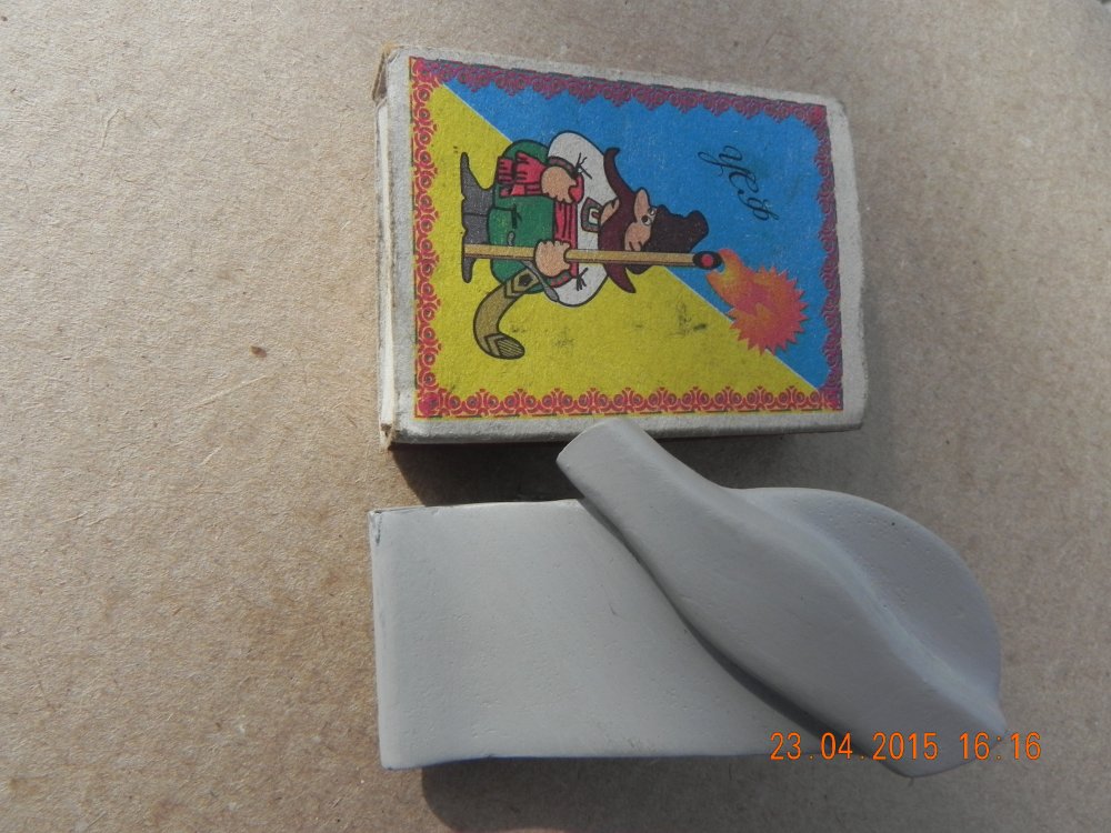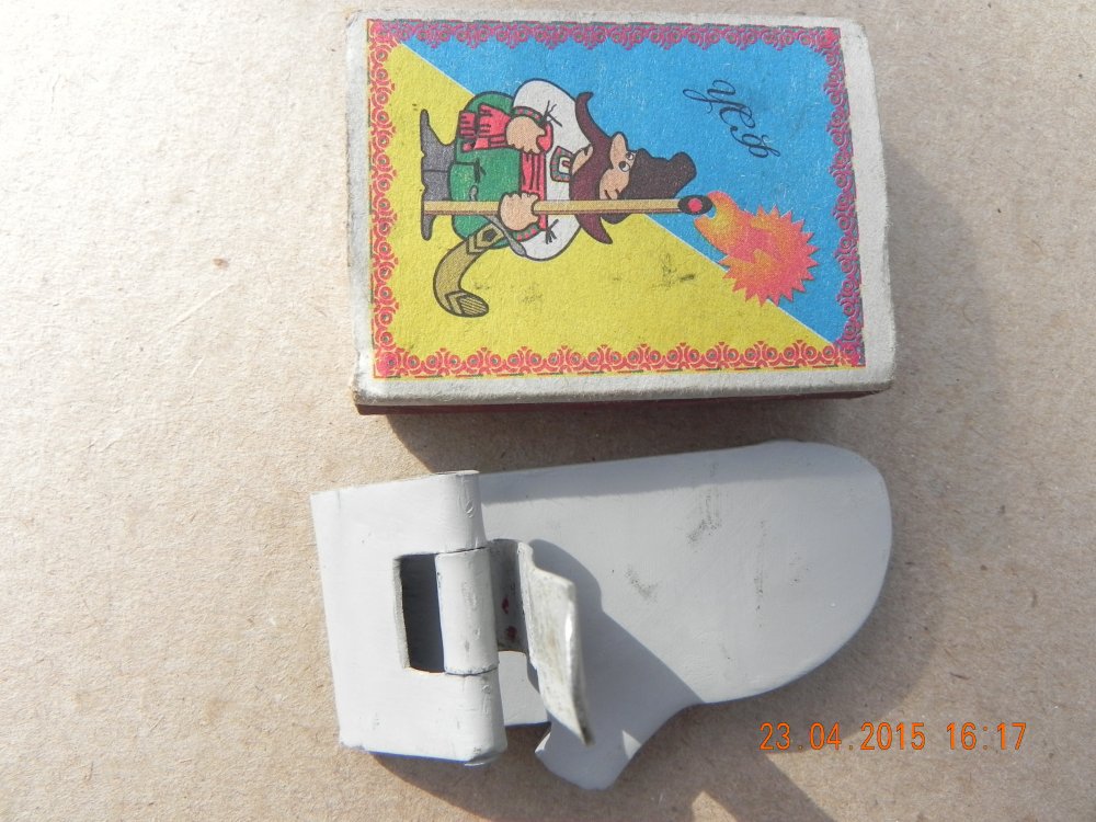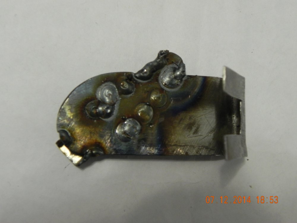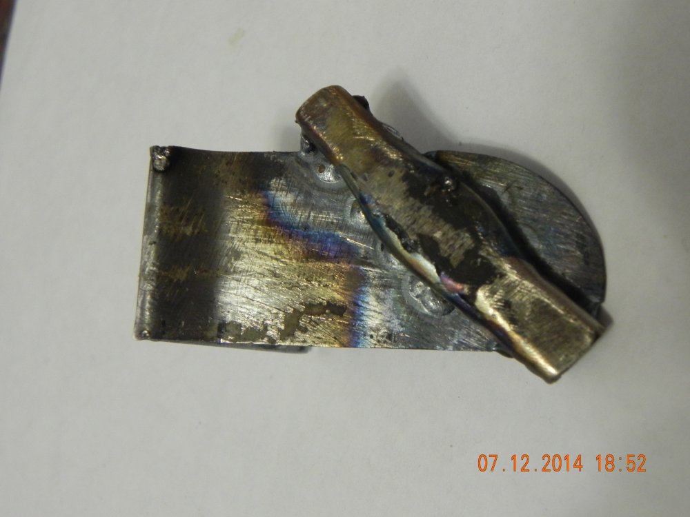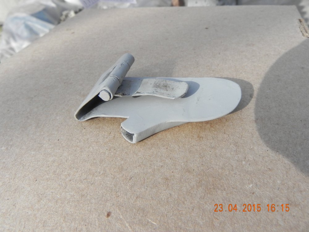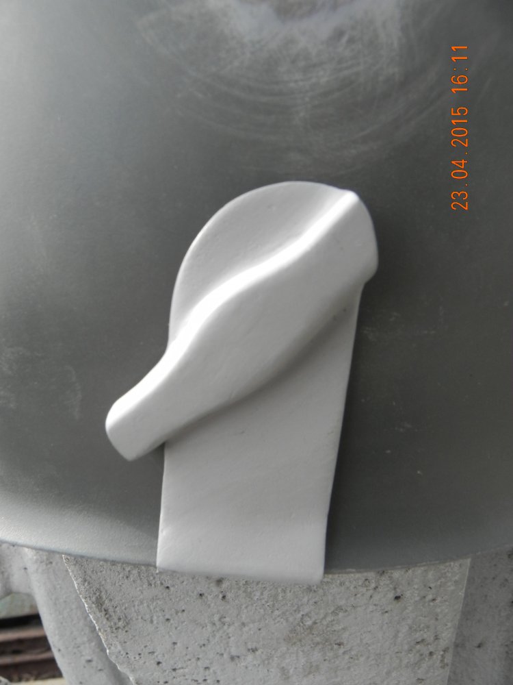 По контуру прилегания двух деталей насверлил отверстий и через них, опять же полуавтоматом, соединил вместе. Попутно ещё раз наварил там, где оставались каверны от предыдущих навариваний. И снова наждак, придание формы. Потом очередь дошла до язычка-зажима. Придал ему на наждаке форму и при помощи гвоздя, который превратился в оську, соединил всё во едино. Отвечаю на вопрос Саши о том, крепко ли зажим держит конструкцию. При первом опробовании оказалось, что при попытке зажима на каске язычёк деформируется. Проблему решил закаливанием этого самого язычка методом нагревания на газовой горелке и опусканием в масло. Помогло. Теперь работает. Окончательно обработал на наждаке всю конструкцию, затем наждачкой и погрунтовал. Результат на сегодня уже демонстрировал. Понимаю, что в оригинале внутри самого зажима под перо было что-то, типа пружинки. Для фиксации этого самого пера. Но в моей конструкции этого нет. Пока нет. Перед покраской подшпаклюю точечно некоторые мелкие дефектики. Цвет планируемой окраски шлема- на самом шлеме. Это тренировался, пробовал аэрограф. Океанический серый и полевой серый 2:1. Насчёт трафарета и пера ещё не определился. Приму совет более авторитетных в этих делах камрадов.