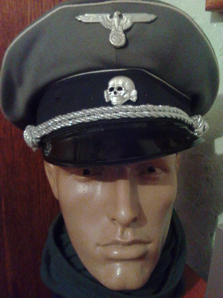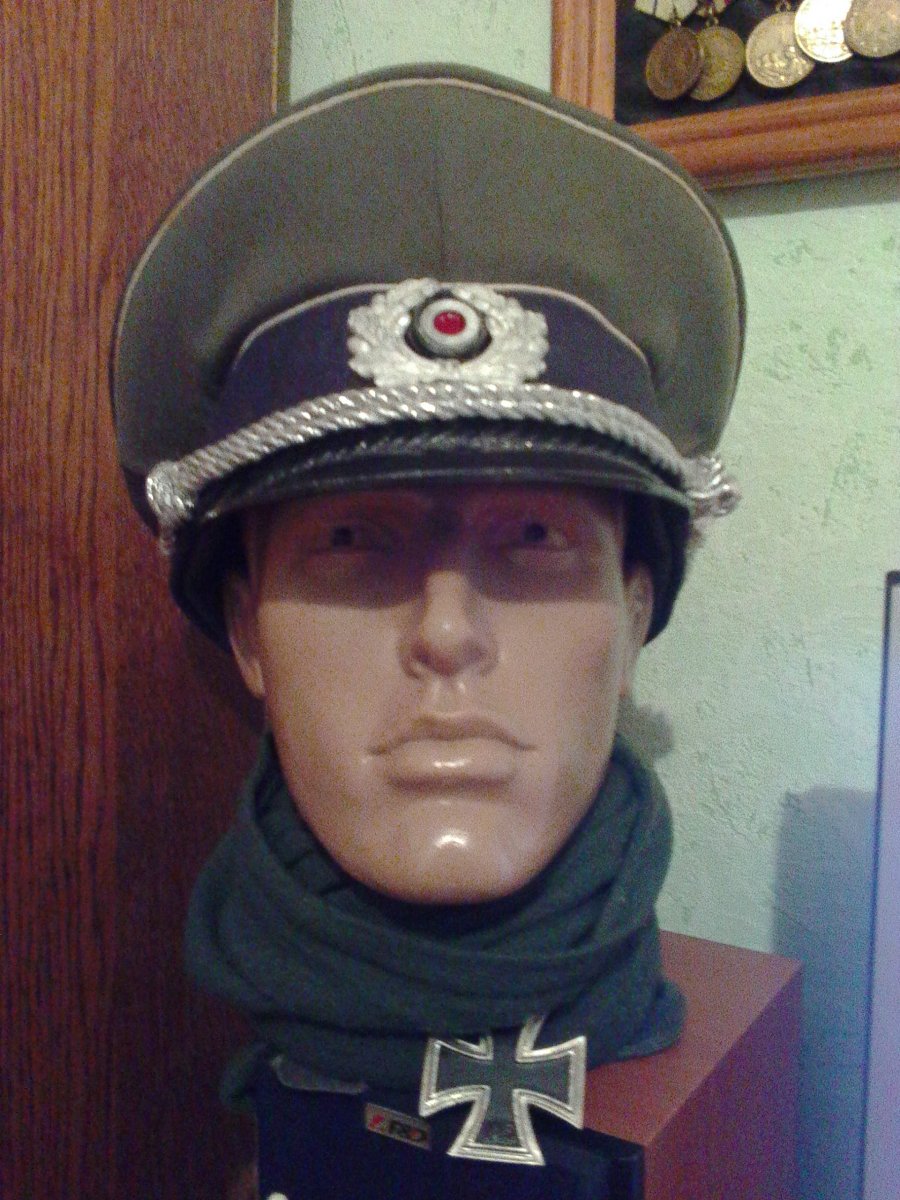 продам фуражки переделка под вермахт и сс тема обновляемая и пополняемая .Фуражки основа ГДР используется качественная фурнитура. лот 1 Фуражка вермахт качественная антуражная ткань.Качественная металлическая фурнитура.Зернистая пуговица. Из нюансов след молли практически не заметно .Размер 57 Продано отличная фуражка для антуража.