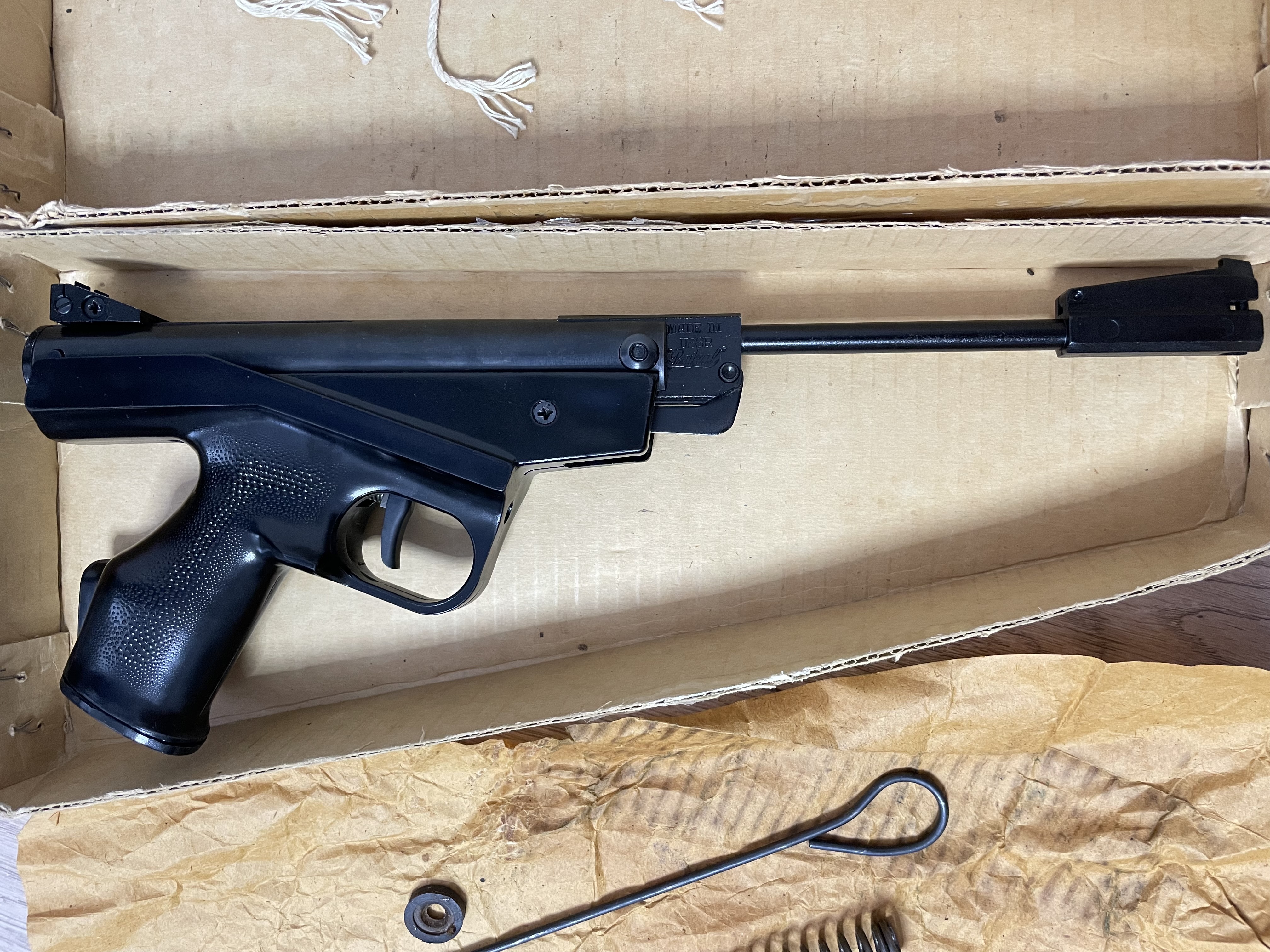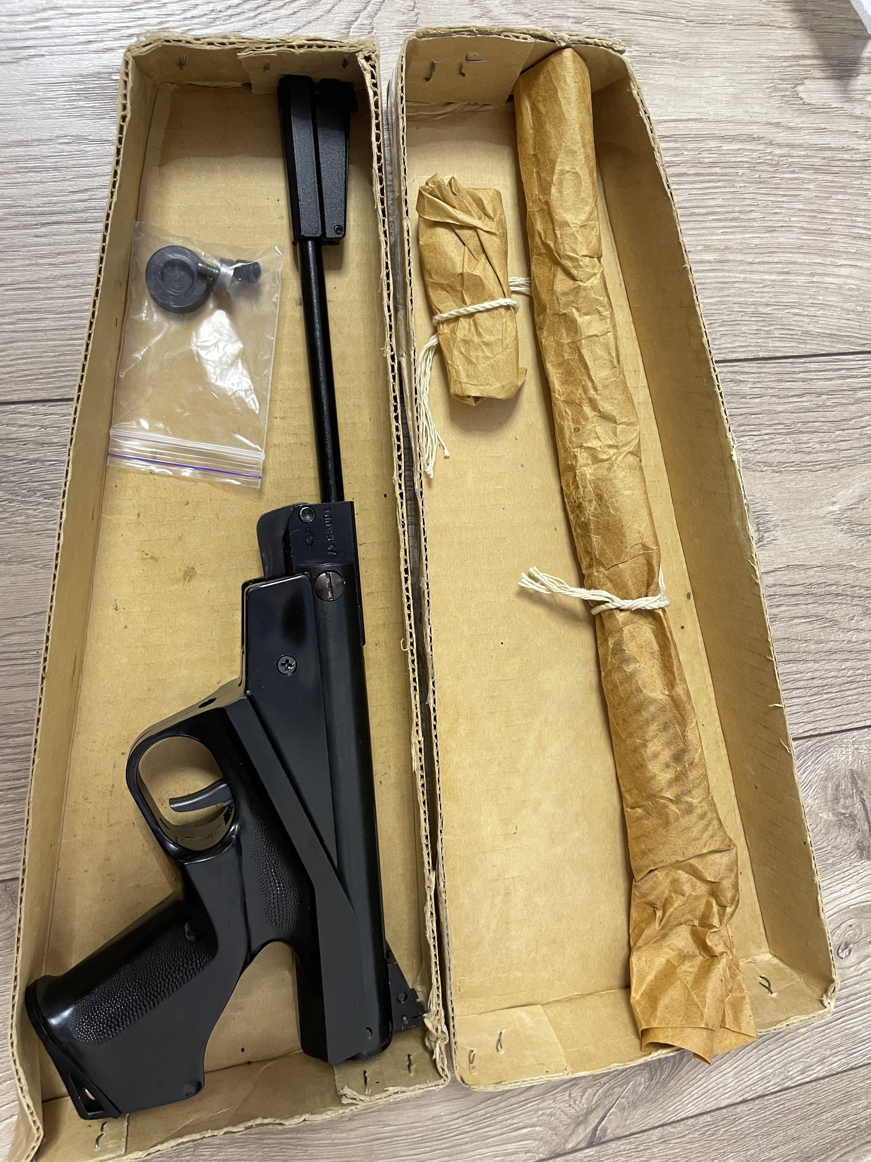 Продам раритет, самі перші випуски, до цього йшла 40ва модель, стан вітринний, настріл мінімальний, комплект повний як з магазину. Муфта ствола метал, мушка підпружинена, регульована по висоті. Цілик металевий, регул. по горизонталі. Задник металевий. Спуск регулюється через отвір у скобі. Була досі встановлена рідна шкіряна манжета, замінено на нову таку ж з комплекту поставки. Пружина так само поставлена нова рідна з коробки. Докупив комплект від Олега2100 але не ставив. Комплект пістолет, рідна коробка, шомпол, мушка, цілик, рідна б.у. пружина, компл. від Олега. (манж. поліуретанова, грибок під неї, втулка перепуска) Ціна 4500грн. 0671600642