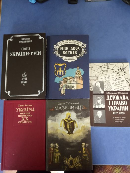 64) Гунчак Т. Україна перша половина ХХ століття. - К.: Либідь, 1993. - 288 с. - 30 грн. 65) Субтельний О. Мазепинці. Український сепаратизм на початку XVIII ст. - К.: Либідь, 1994. - 240 с. - 30 грн. 66) Копиленко О. Держава і право України 1917-1920. - К.: Либідь, 1997. - 208 с. - 20 грн. 67) Історія України в прозових творах і документах. Друга половина XVI- перша половина XVII ст. - К.: Україна, 1996 - 413 с. - 30 грн. 68) Полонська-Василенко Н. Історія України (в двох томах). - К.: Либідь, 1995 - 60 грн. 69) Історія України. Нове бачення (в двох томах). - К.: Україна, 1996. - 60 грн.