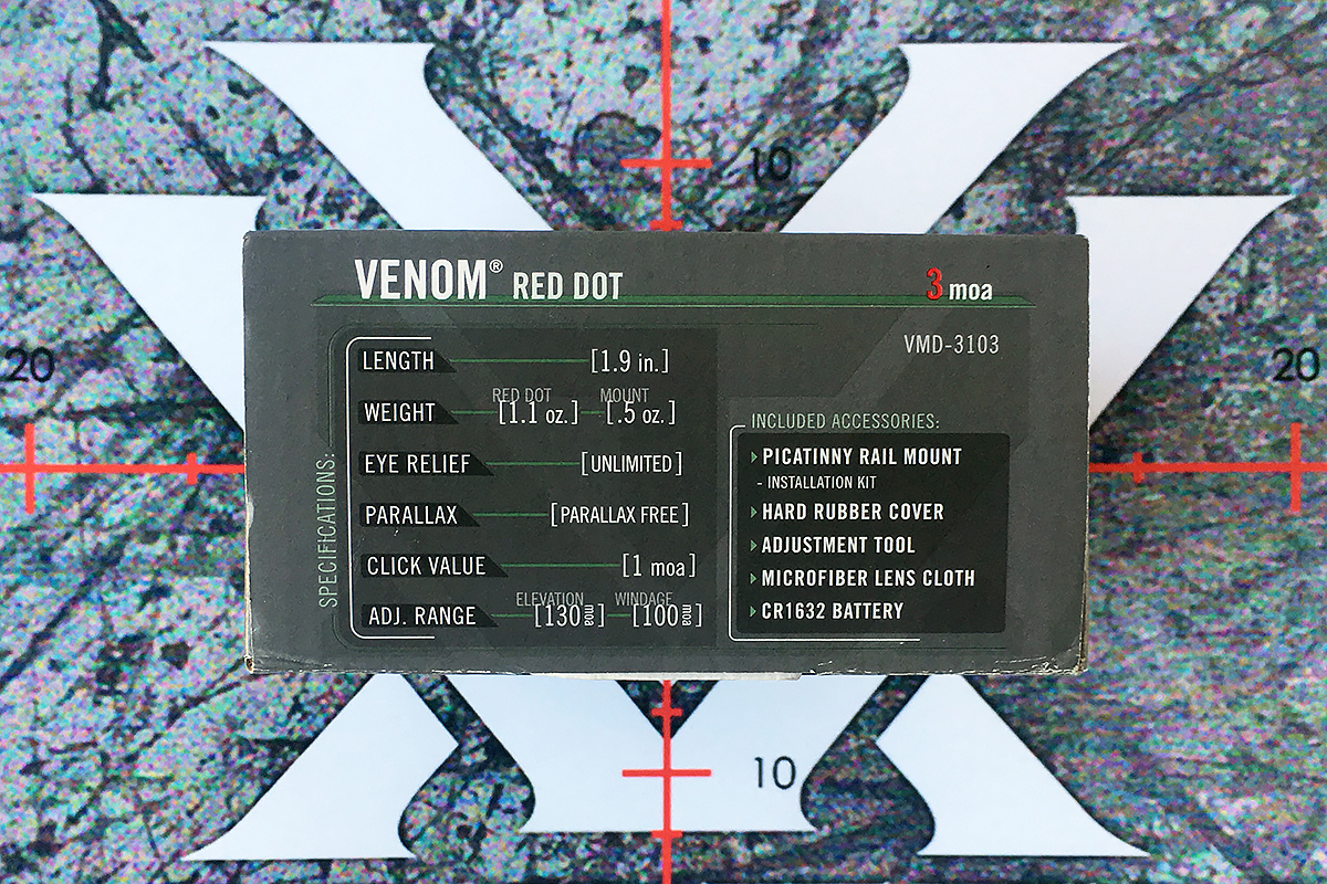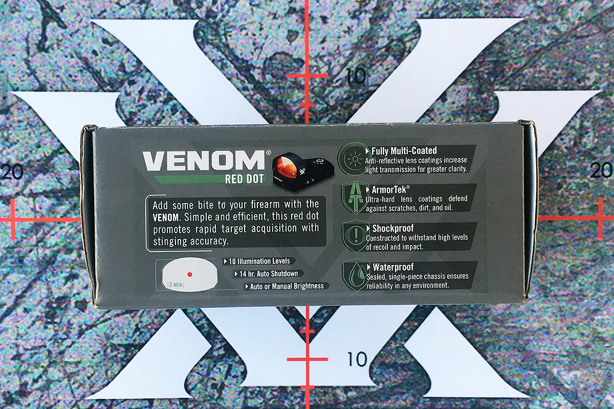 Особенности коллиматора Vortex Venom Red Dot, 3 MOA: Многослойное просветляющее покрытие линз - полное многослойное антибликовое покрытие (Fully Multi-Coated) позволяет достичь максимального светопропускания и четкости изображение. Оптическая система премиум класса - обеспечивает широкое поле зрения с исключительным разрешением от края до края, что способствует быстрому захвату цели. Регулировка яркости прицельной марки - 10 уровней яркости позволяют легко адаптировать прицельную марку к любым условиям освещения в любое время суток. Также можно перейти в автоматический режим. Нет ошибки параллакса - коллиматор имеет настолько низкую ошибку параллакса, что не влияет на результат выстрелов. Неограниченное расстояние от глаза - независимо от того, как далеко находится глаз от коллиматора, точка и цель всегда будут идеально видны. Водонепроницаемые уплотнительные кольца предотвращают проникновение влаги и пыли, тем самым повышая надежность коллиматора в любых условиях. Ударопрочный (Shockproof) - прочная конструкция выдерживает отдачу и удар. Анодированное покрытие - обеспечивает матовую поверхность с низким уровнем бликов и помогает маскировать положение стрелка. Это покрытие будет защищать коллиматор от царапин и коррозии в течение многих лет. ArmorTek ® - сверхтвердое, устойчивое к царапинам покрытие защищает внешние линзы от царапин, масла и грязи. Время работы элемента питания - до 150 часов при максимальных настройках, до 30 000 часов на низких настройках (14-часовое автоматическое отключение продлевает время работы элемента питания).
