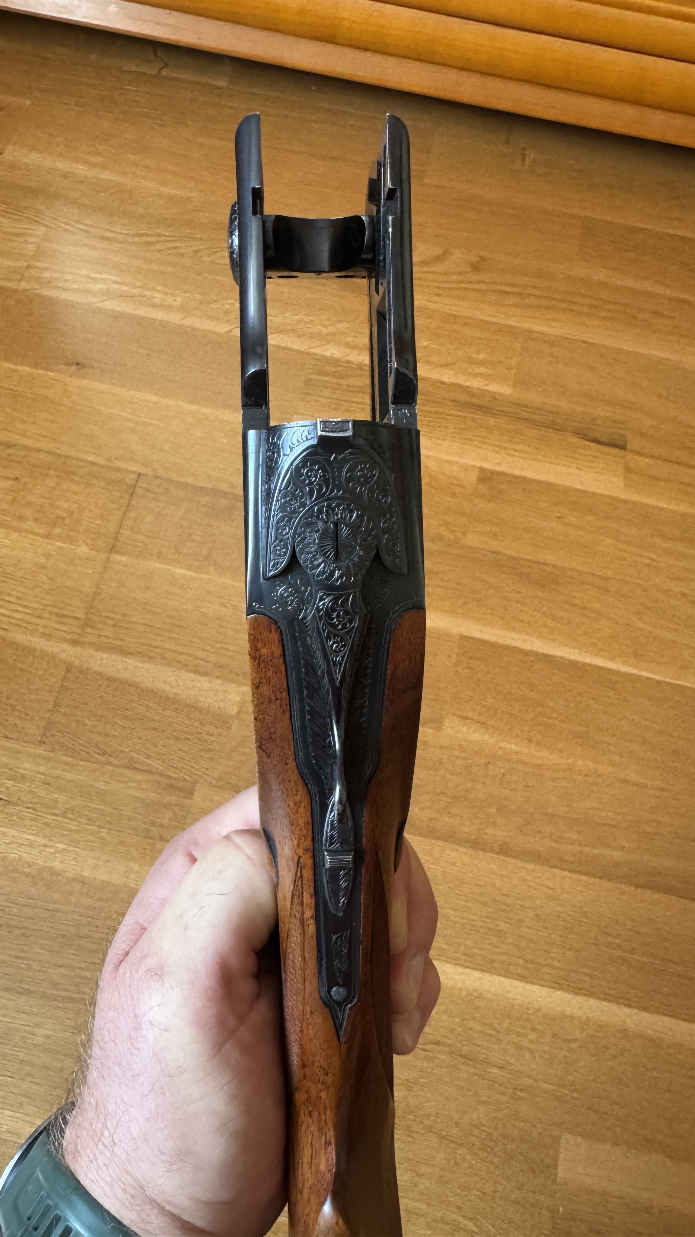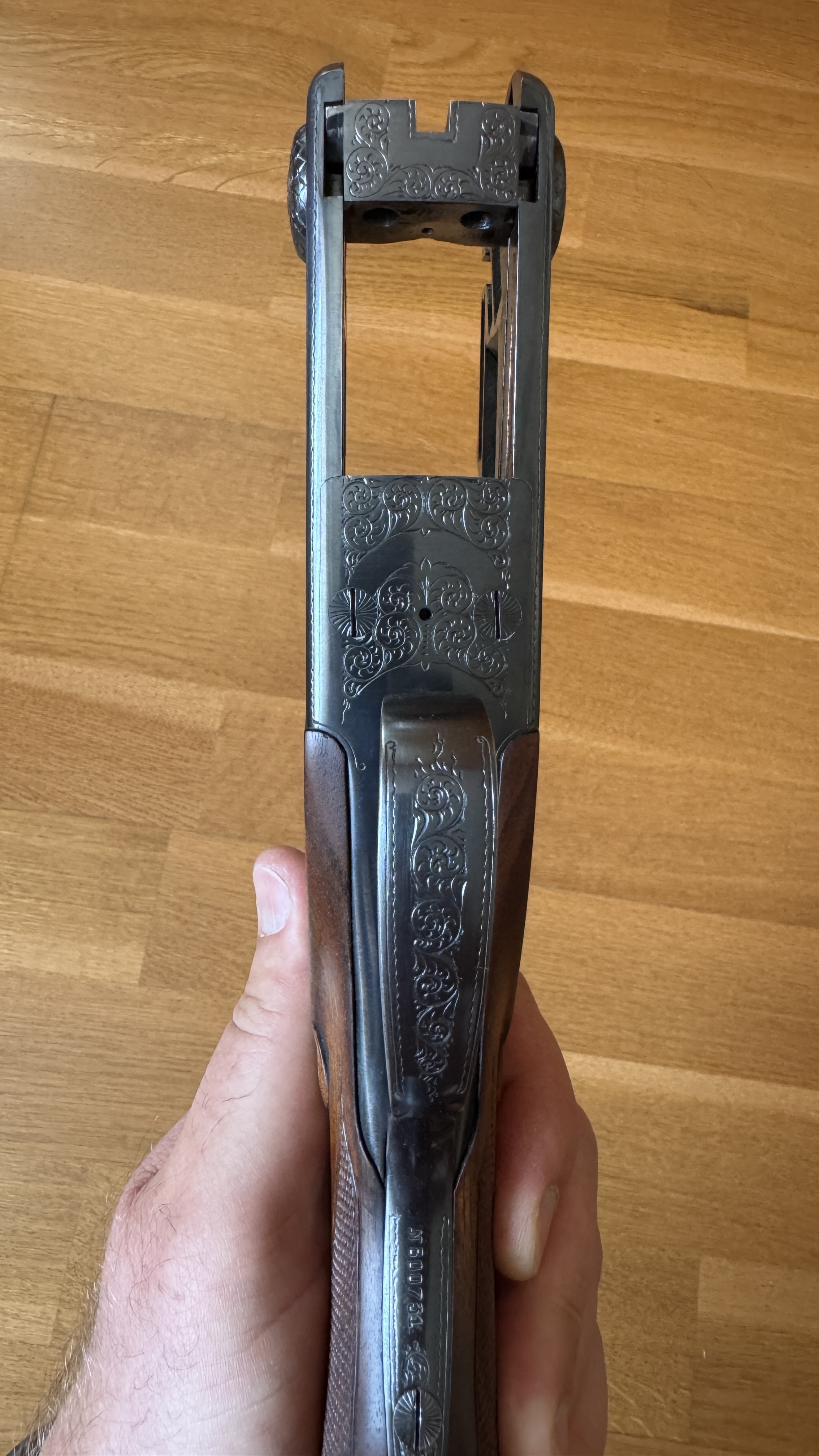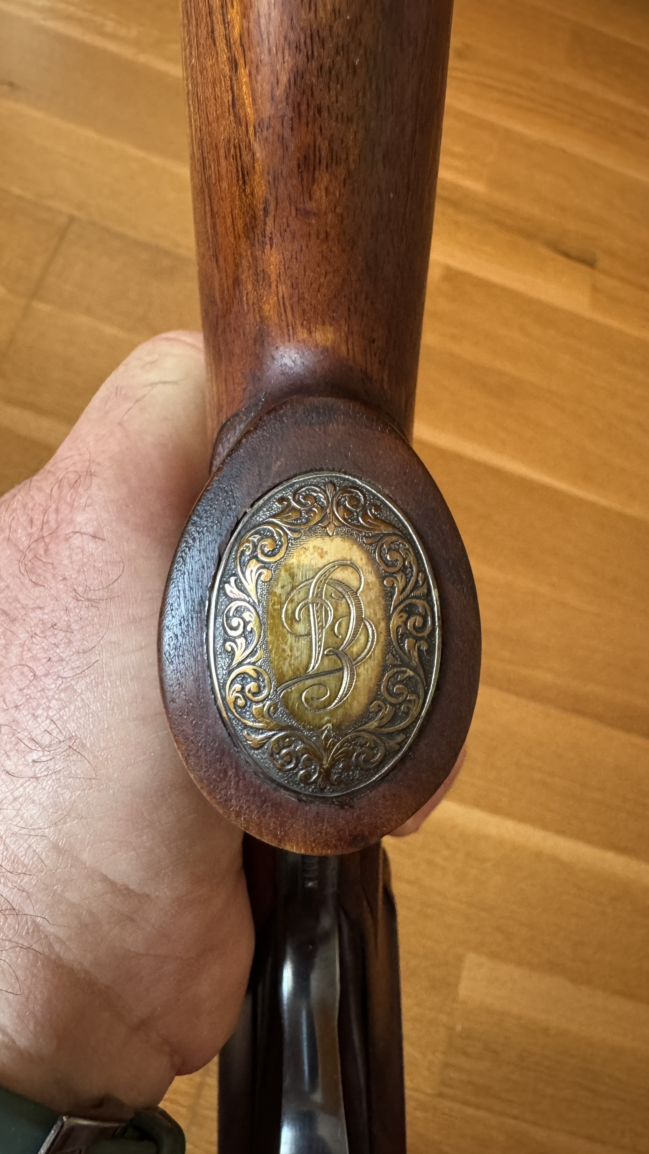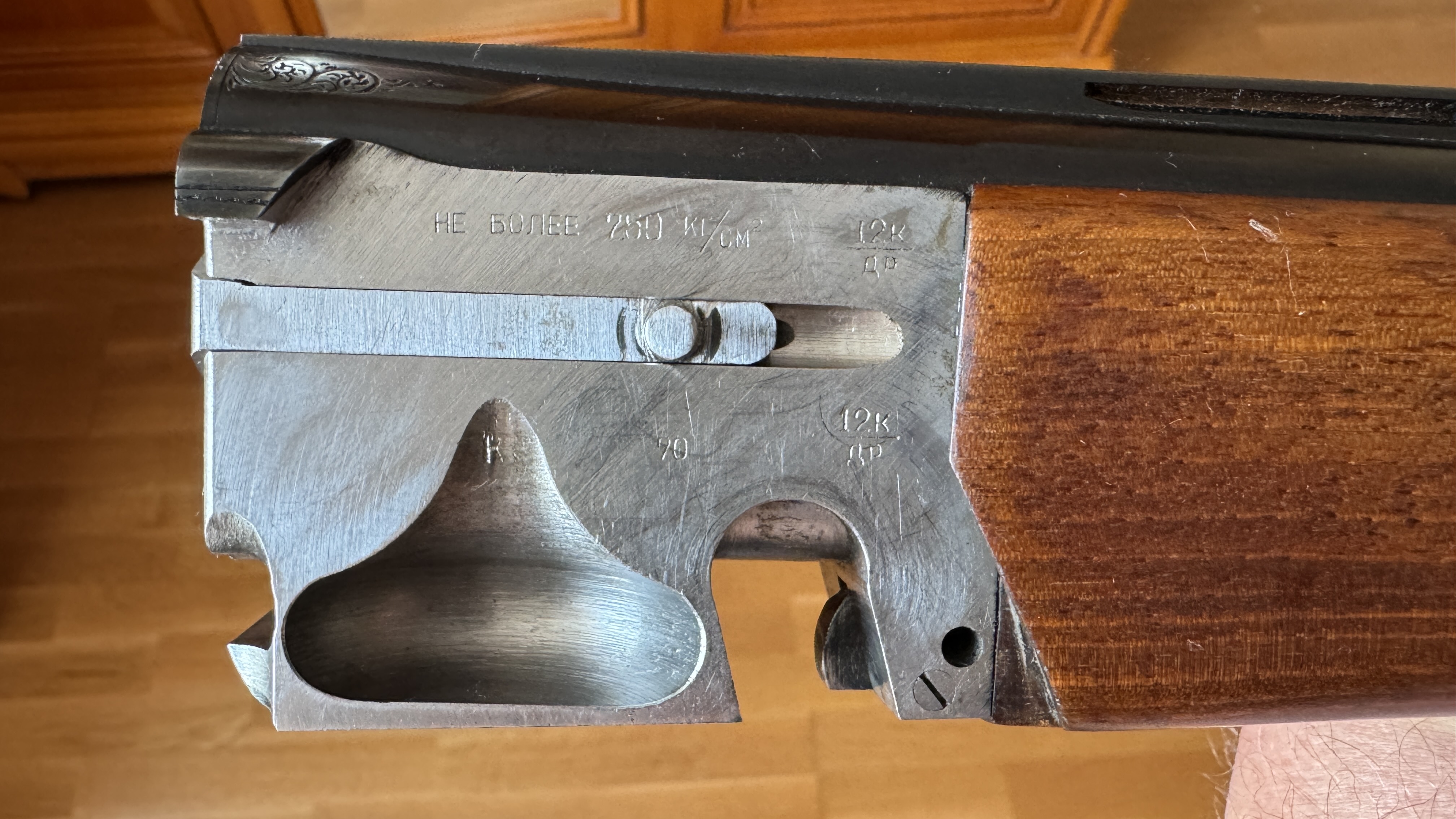 Рушниця в унікальному первозданному вигляді, жоден гвинт не тронутий, привезена з Німеччини офіцером (срібна монограма на прикладі). Стріляла дуже мало. По суті нова рушниця 12 калібр, звуження «раструб». Стволи 67 см Рушниця в Києві Ціна 2450 доларів Вайбер 0952740907