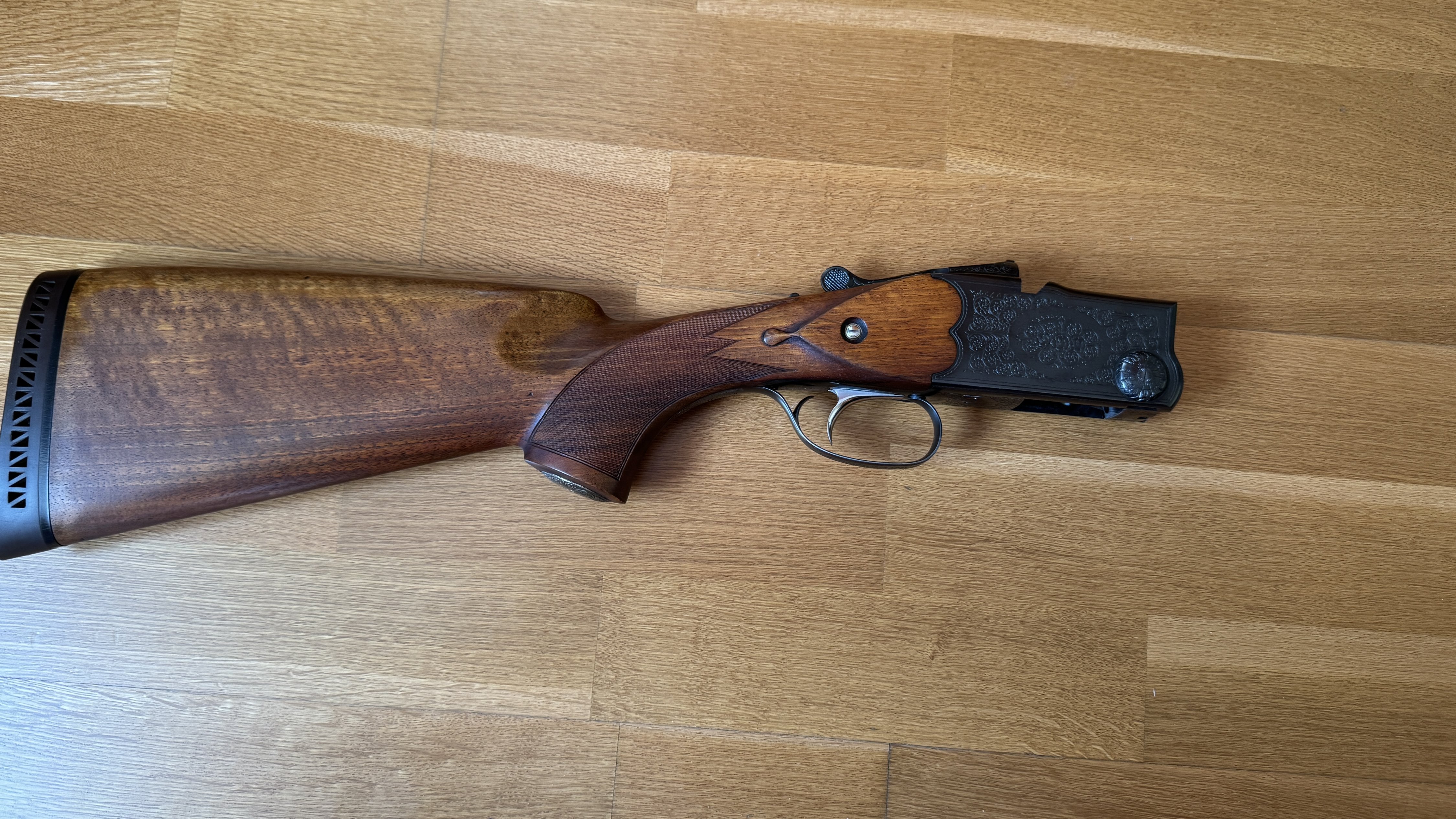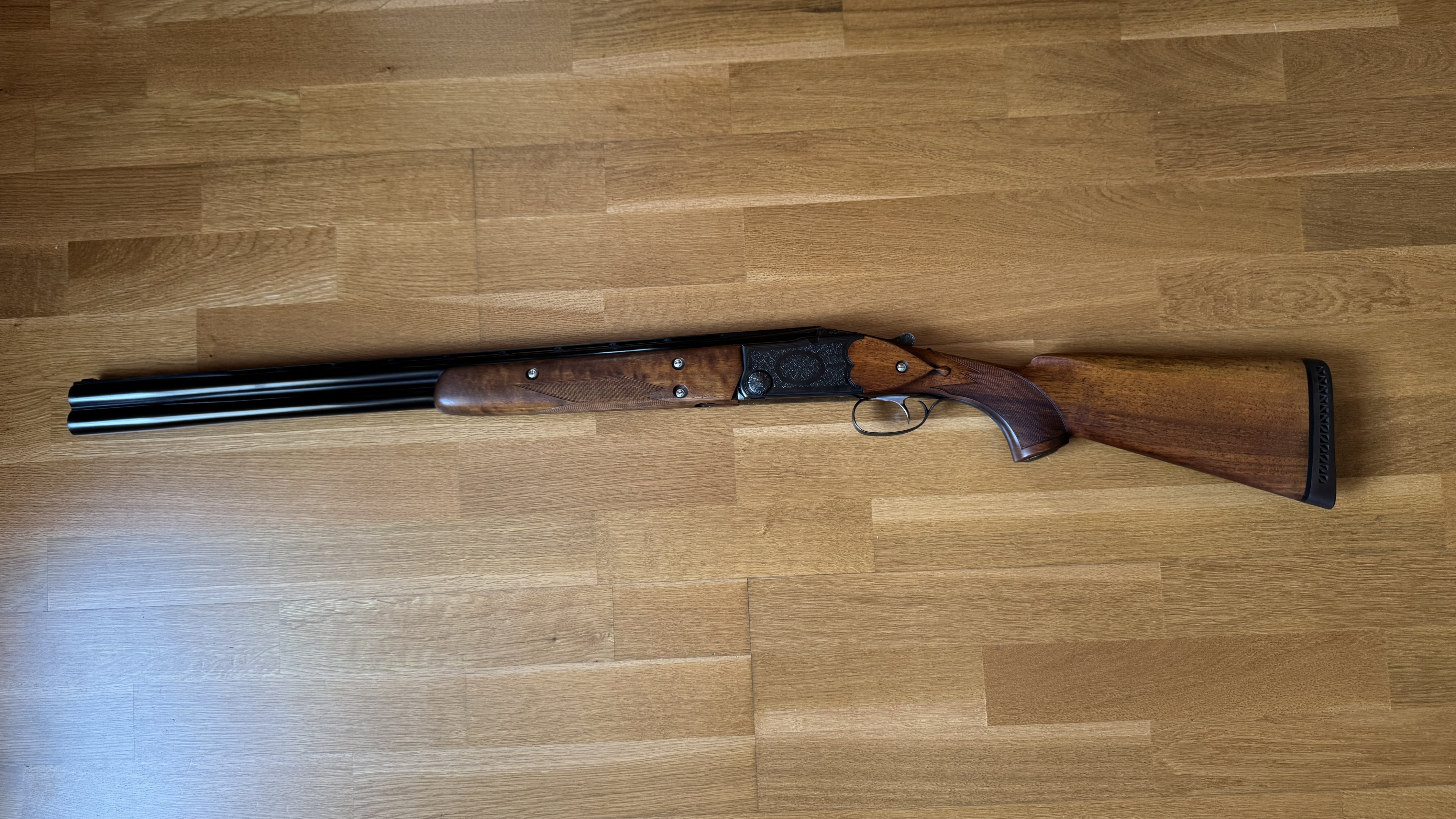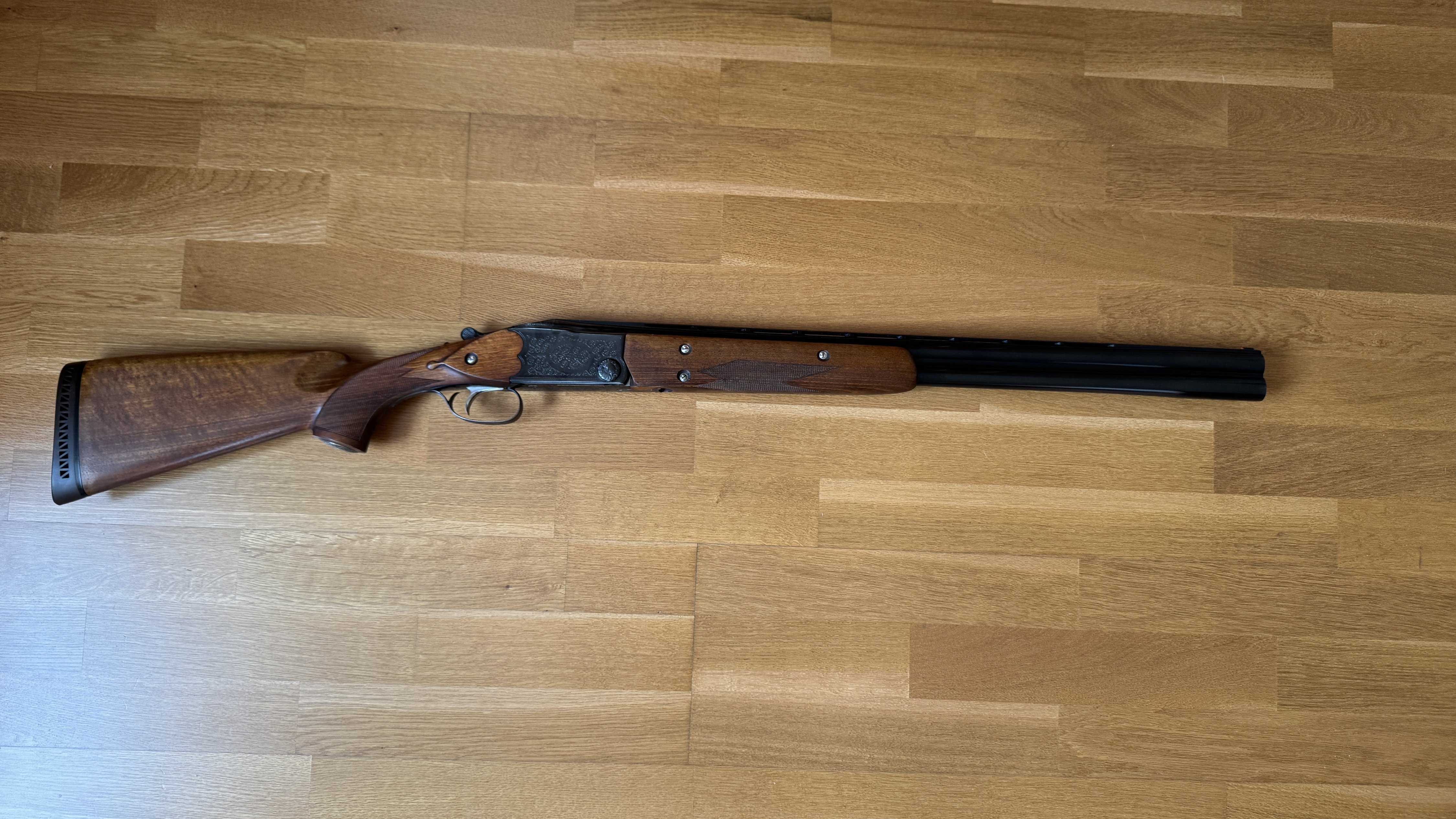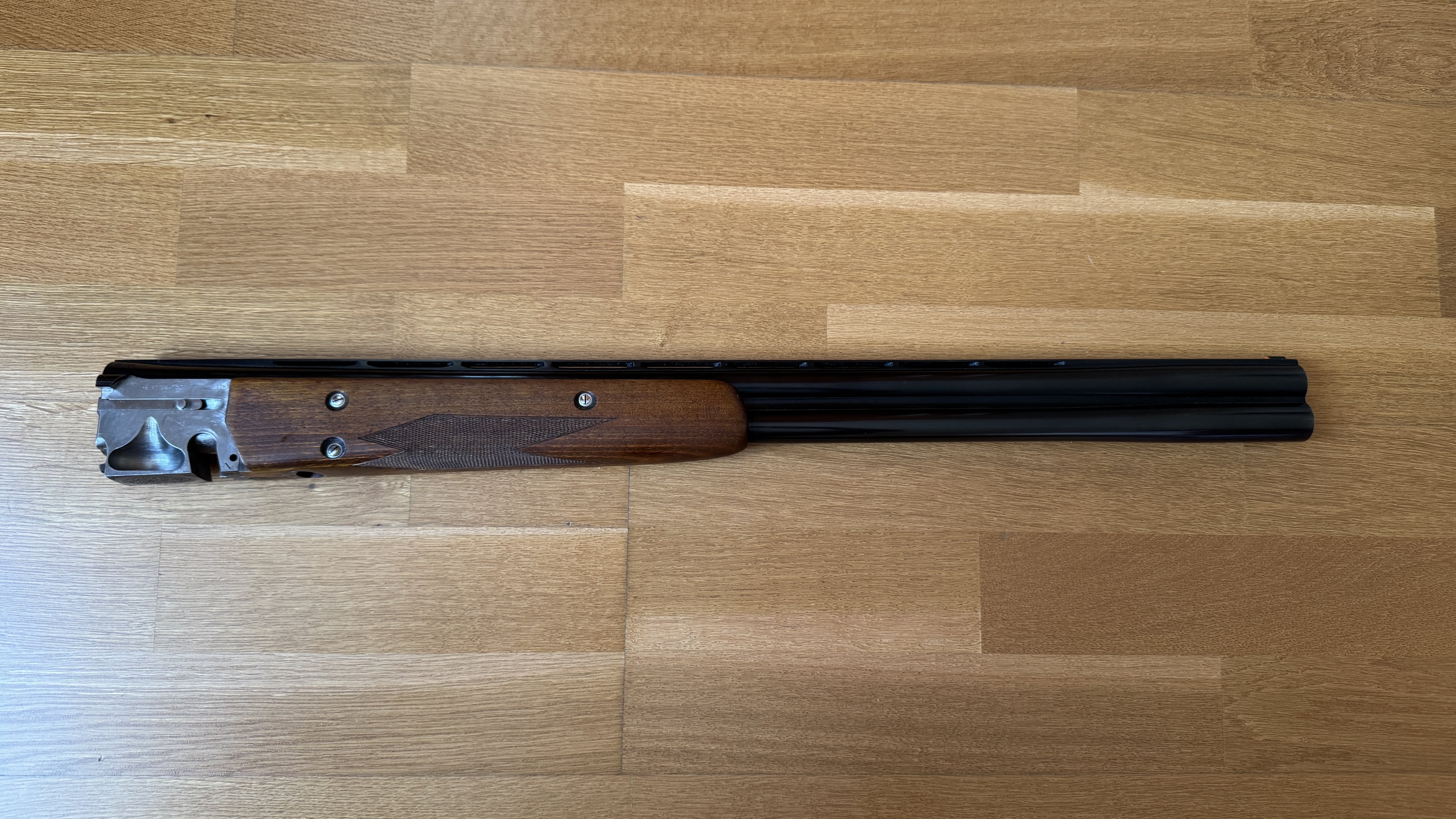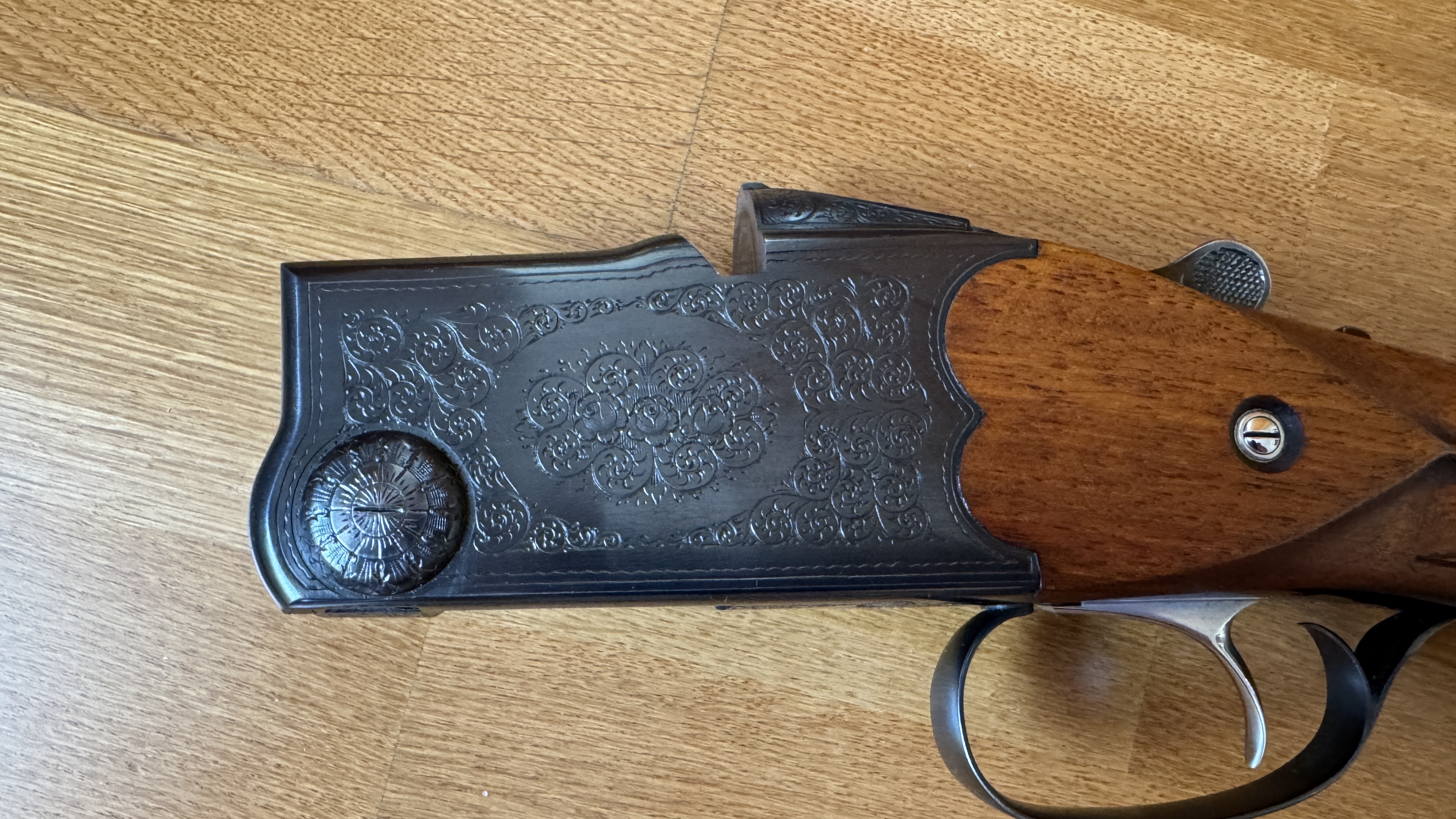 Рушниця в унікальному первозданному вигляді, жоден гвинт не тронутий, привезена з Німеччини офіцером (срібна монограма на прикладі). Стріляла дуже мало. По суті нова рушниця 12 калібр, звуження «раструб». Стволи 67 см Рушниця в Києві Ціна 2450 доларів Вайбер 0952740907