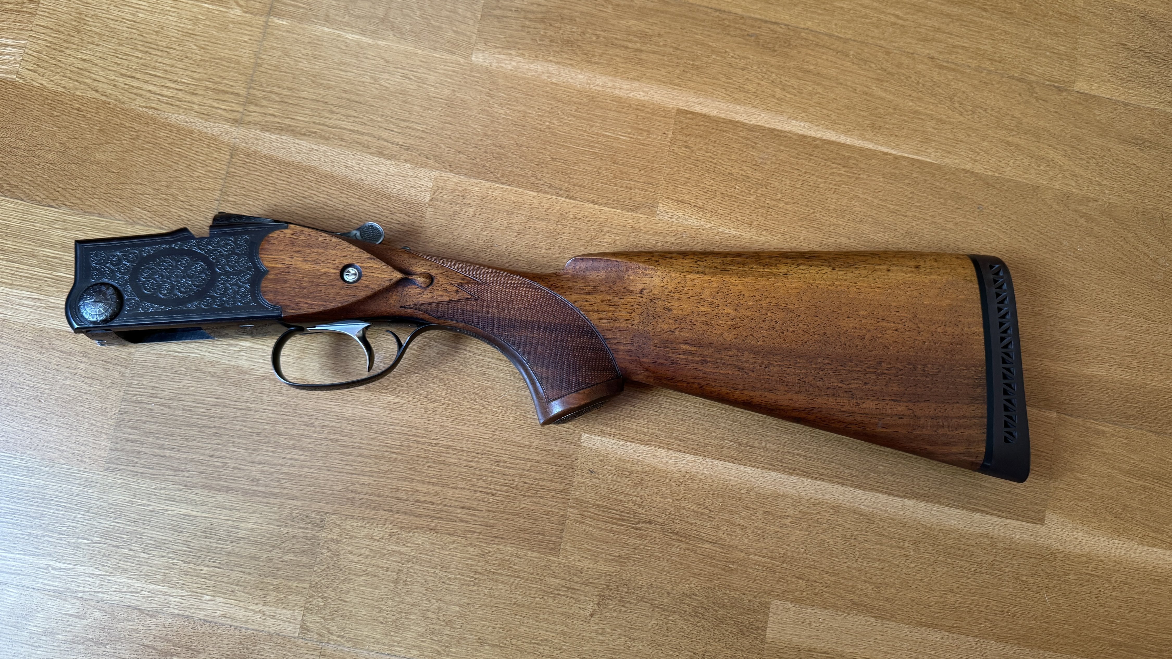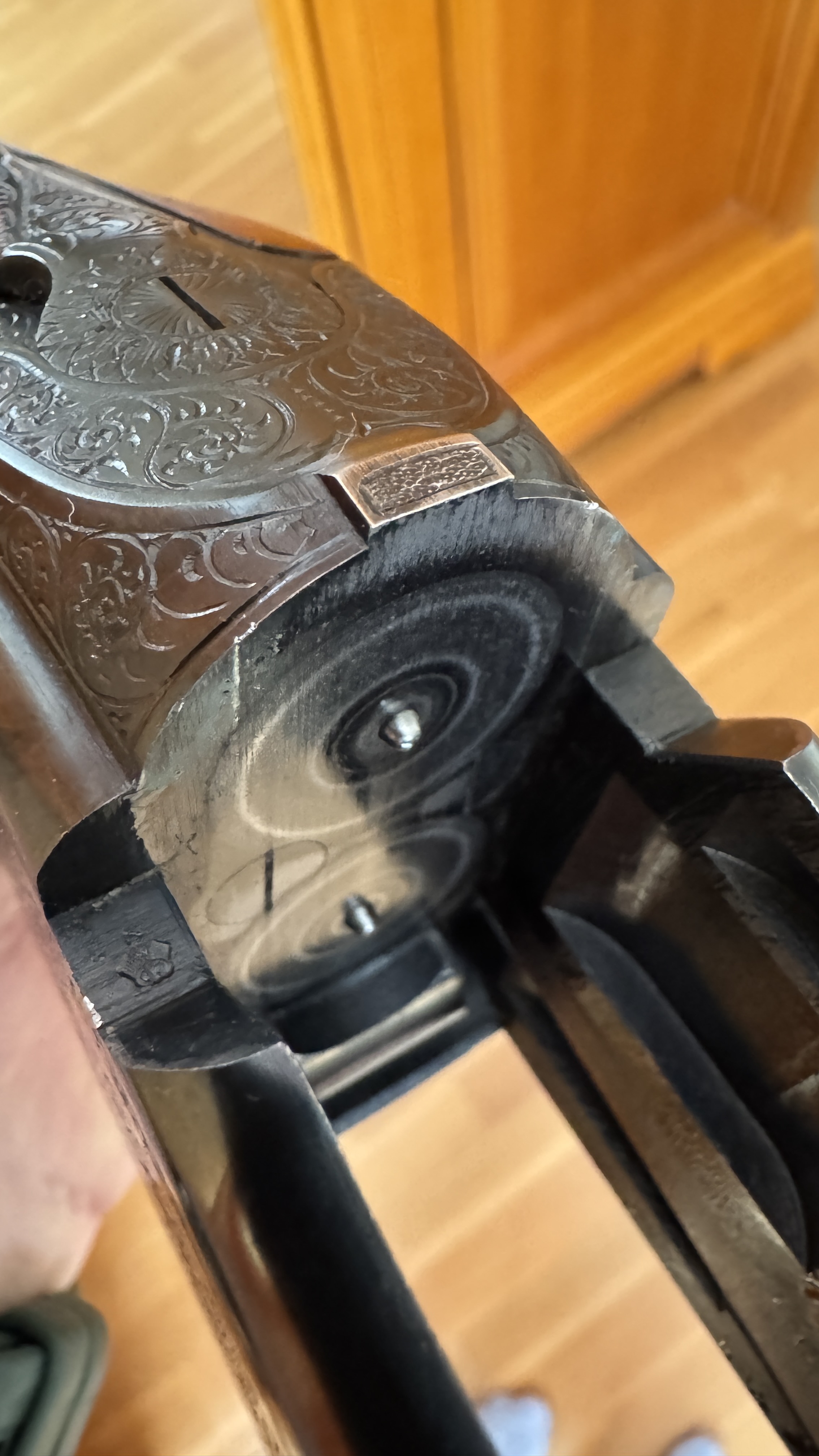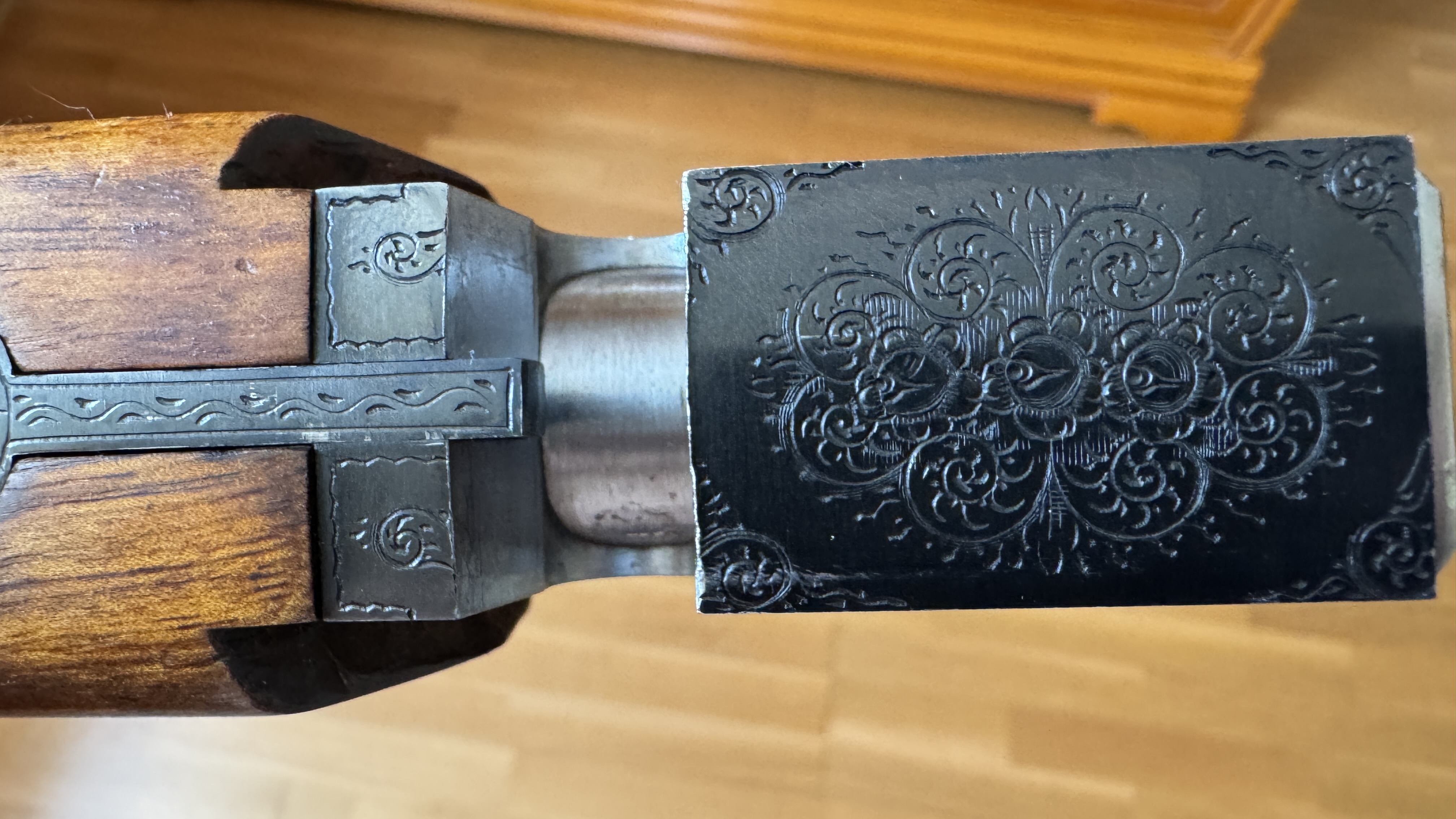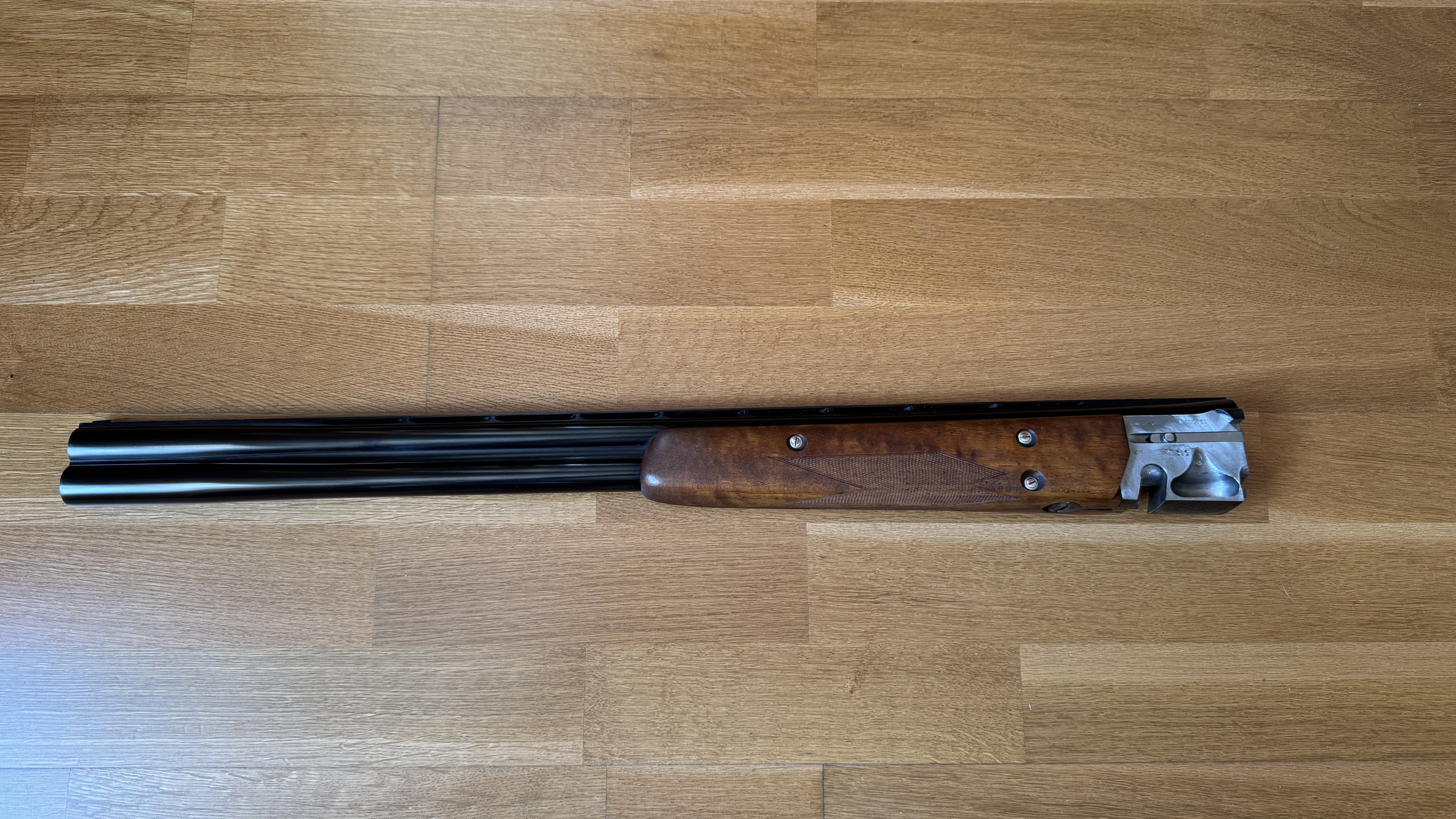 Рушниця в унікальному первозданному вигляді, жоден гвинт не тронутий, привезена з Німеччини офіцером (срібна монограма на прикладі). Стріляла дуже мало. По суті нова рушниця 12 калібр, звуження «раструб». Стволи 67 см Рушниця в Києві Ціна 2450 доларів Вайбер 0952740907
