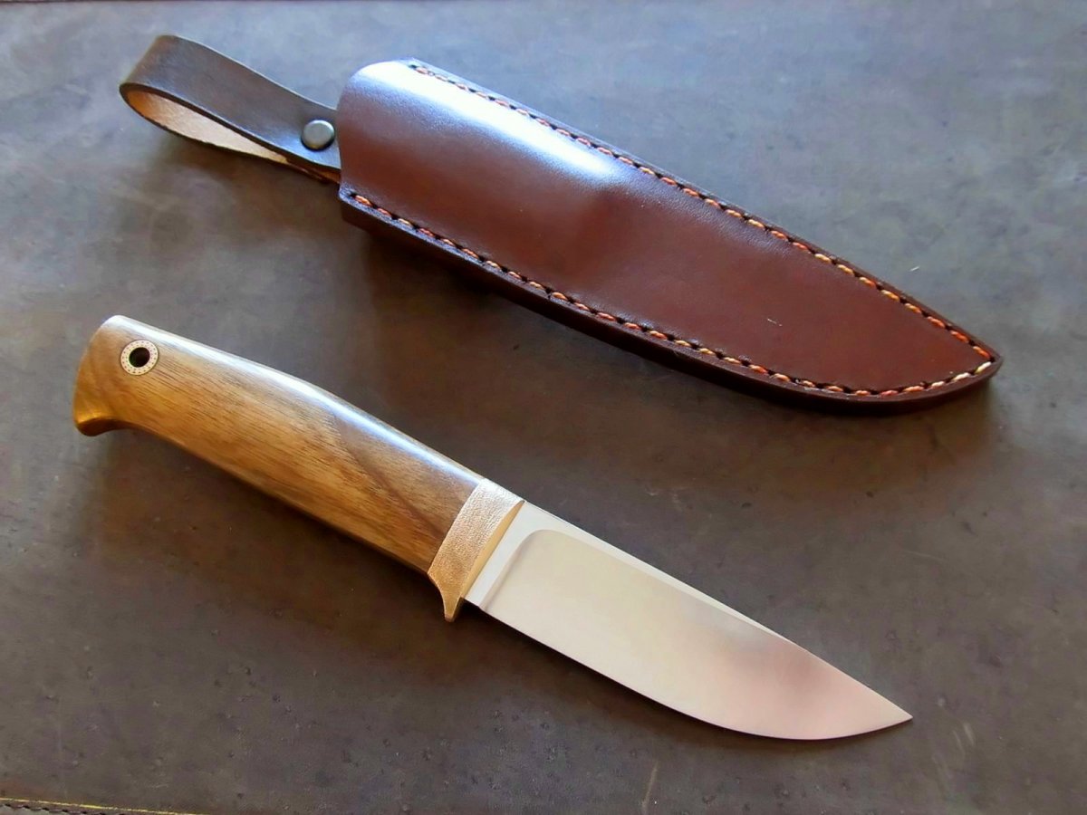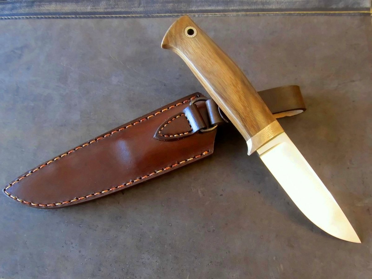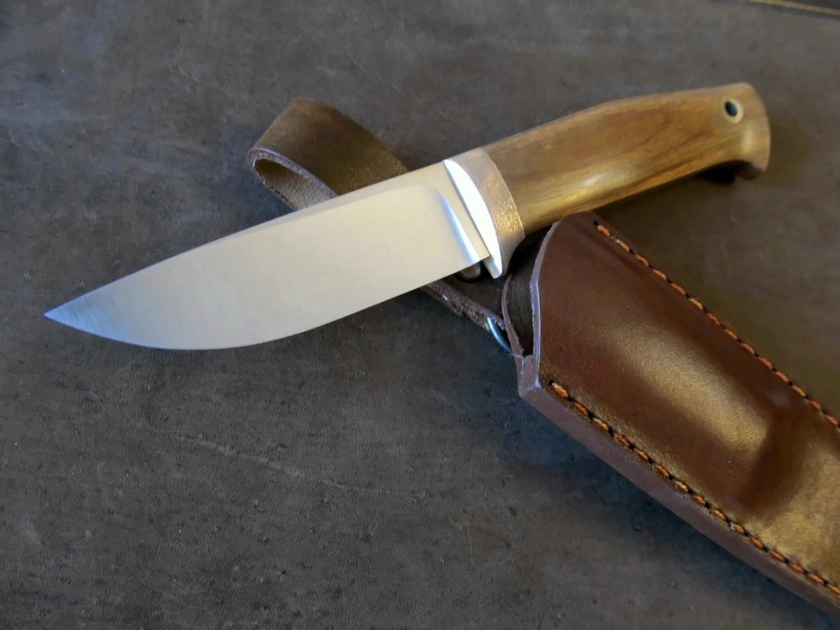 Клинок : шведська високлегована нержавіюча сталь Sandvik 19C27 (розроблялась з акцентом на виготовлення клинків.) Довжина: 95мм; товщина 4мм Твердість 60 HRC. Cпуски увігнуті, машинний фініш. Руків'я: 110мм; найбільша товщина 18мм. Больстер бронза (фактура та трохи "застарив"), дерево - горіх, темлячній пін Шкіра - чепрак , формовка , фарба, апретура. Прошивка вощеною ниткою. Цена 1500 грн Оплата на карту ПБ, доставка НП за рахунок покупця