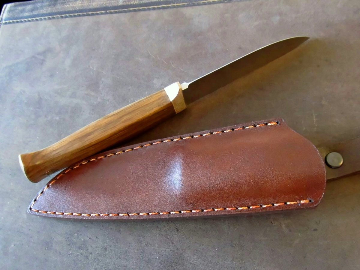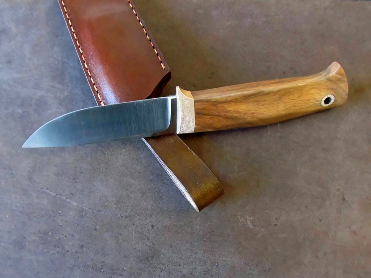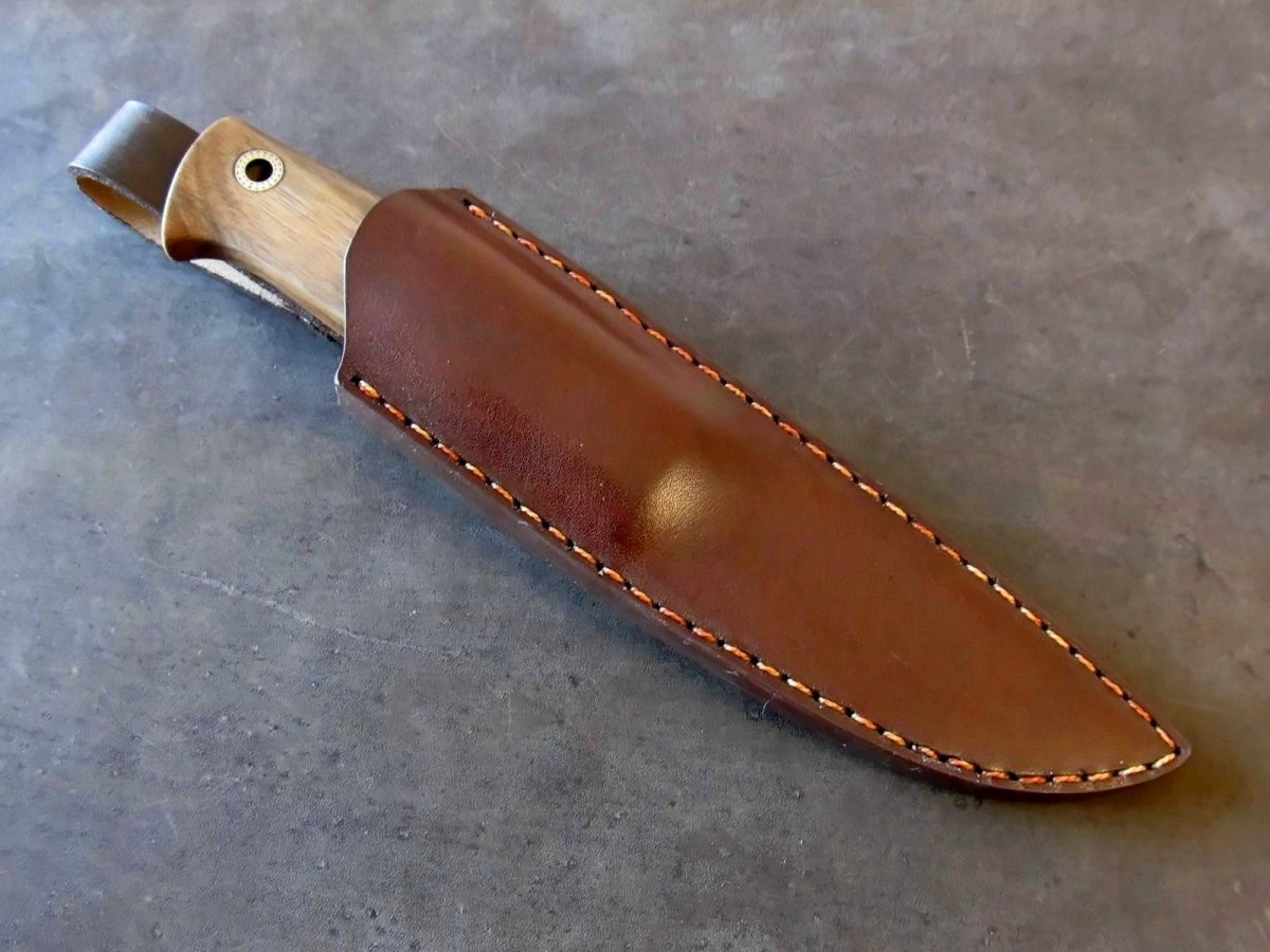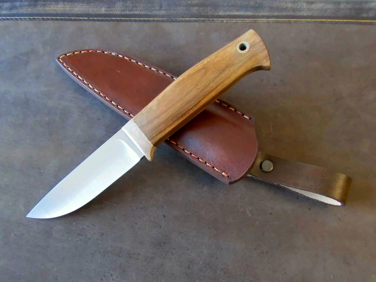 Клинок : шведська високлегована нержавіюча сталь Sandvik 19C27 (розроблялась з акцентом на виготовлення клинків.) Довжина: 95мм; товщина 4мм Твердість 60 HRC. Cпуски увігнуті, машинний фініш. Руків'я: 110мм; найбільша товщина 18мм. Больстер бронза (фактура та трохи "застарив"), дерево - горіх, темлячній пін Шкіра - чепрак , формовка , фарба, апретура. Прошивка вощеною ниткою. Цена 1500 грн Оплата на карту ПБ, доставка НП за рахунок покупця