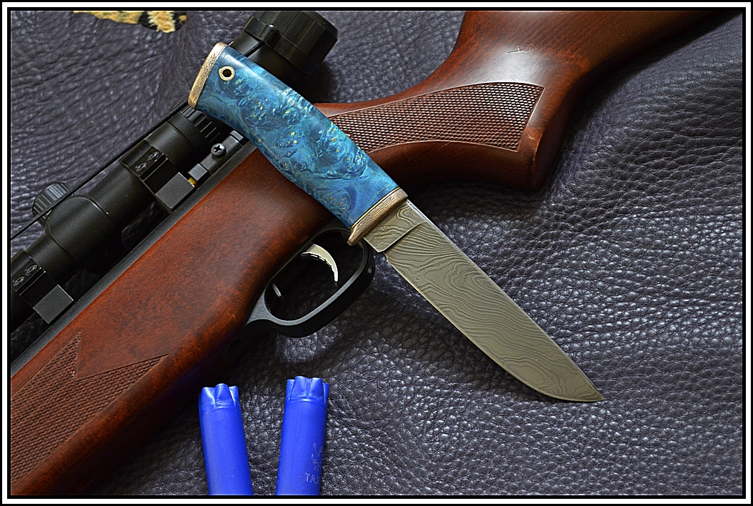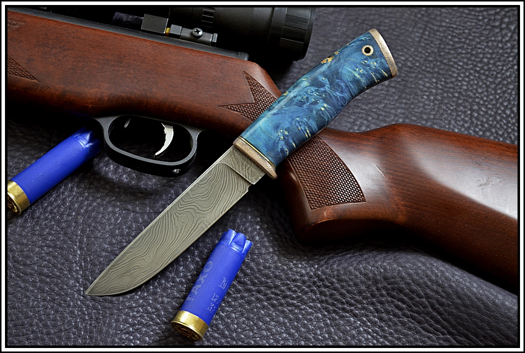 Продам нож "Апрель". цена 2 900 грн. Сумы Авторский дамаск , пакет ХВГ+5ХНМ, твердость 60-61 HRC.Длина клинка 130 мм, толщина в обухе 4.5(фаска по обуху). Ширина 28 мм, сведен в 05мм. Больстер- тыльник мельхиор.Дерево рукояти стабилизированный кап. Чехол кожа Гарантия 24 месяца. По вопросам приобретения желательно звонить 0505648882.