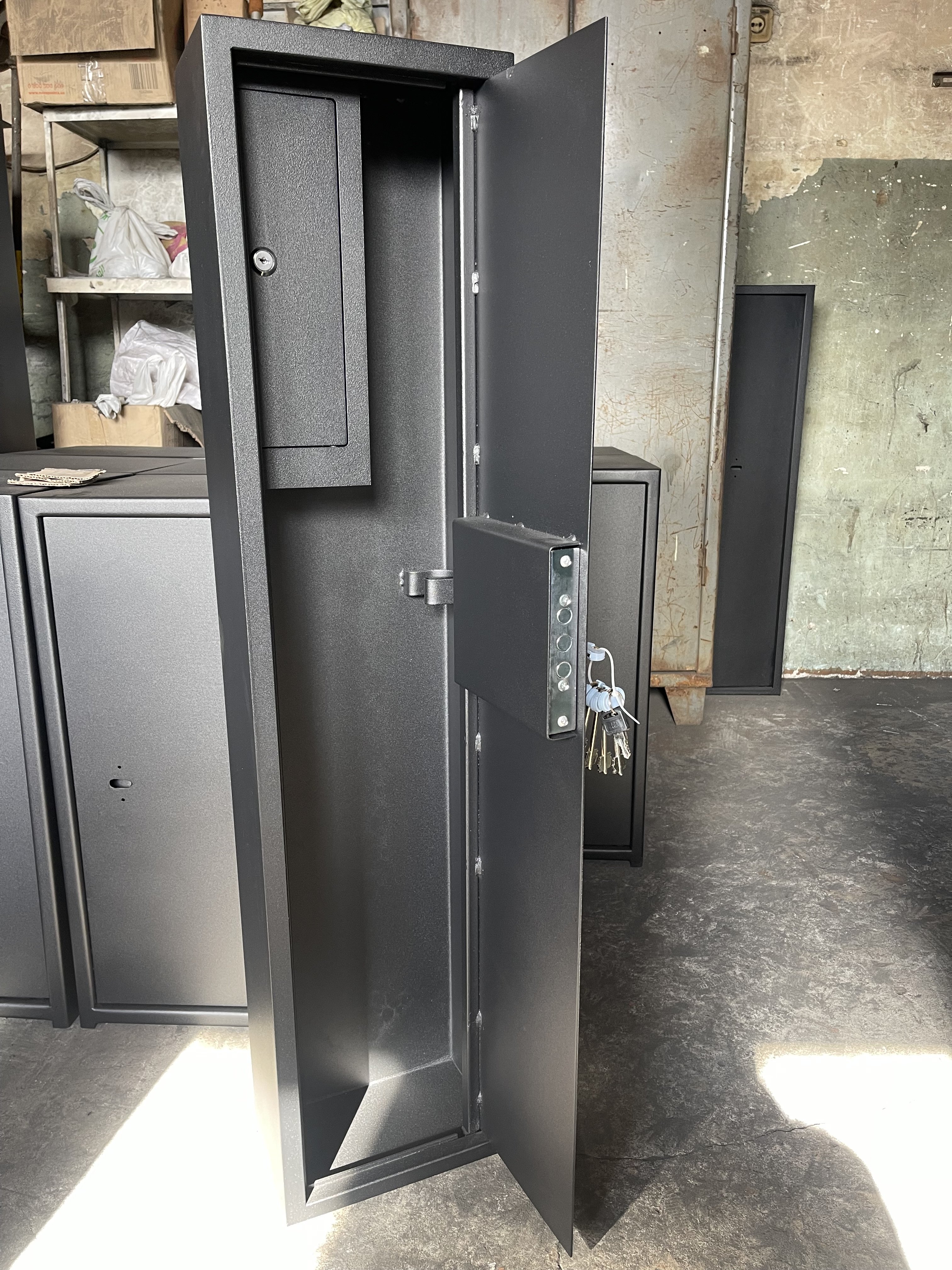 Продам сейф під одну рушницю В 1100 мм ,Ш 250 мм, Г 160 мм, корпус 1,5 мм двері 2 мм, передній фасад усілен профільной трубой 20 /20 мм ,покрашен порошоковою фарбою. Цена 3000 грн Харків, можлива відправка по Україні