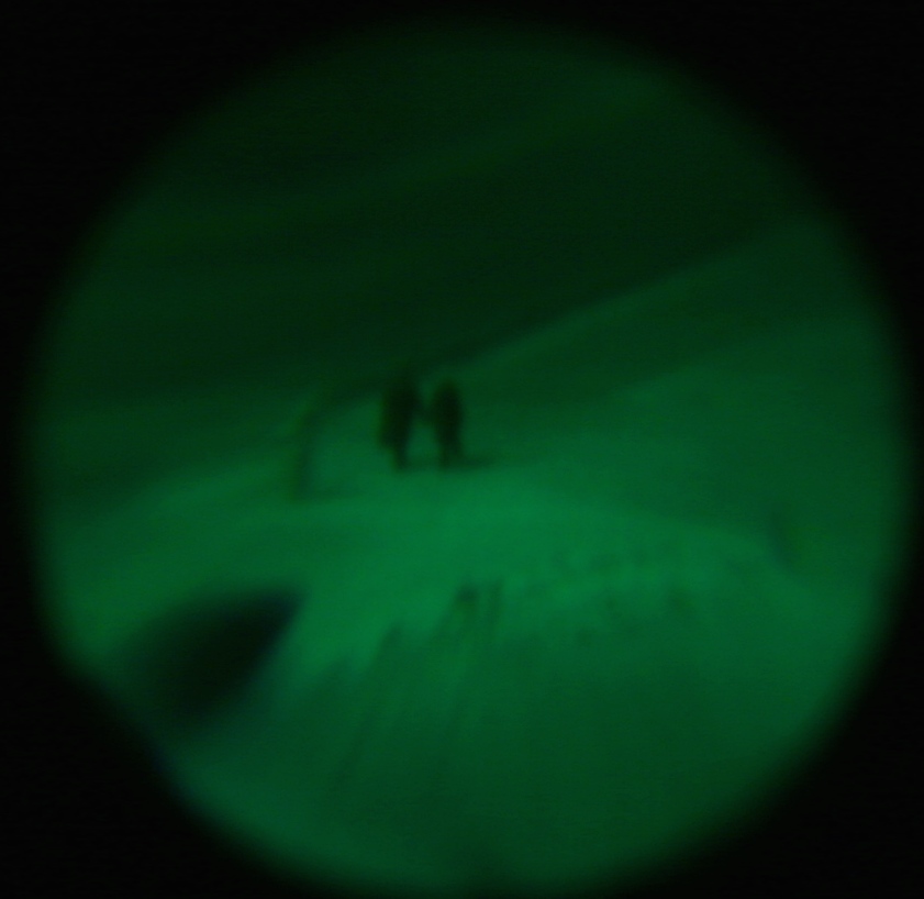 Сфоткал с балкона, метров 300, на снегу при луне. С одного окуляра ПНВ. Фоткал с выдержкой, поэтому размылось изображение. ПНВ увеличил на 2 крат.