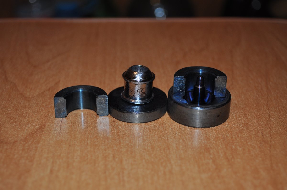 Оно и понятно, что не охлаждаете, потому как форму смазываете. Но в городской квартире от смазанной формы слишком много вони. А под водой сталь остывает быстрее свинца. Быстро остыв форма немного садится (эффект теплового расширения наоборот),при этом обжимает свинец. А с этого уровня уже идёт тепловая усадка свинца, что даёт возможность вынуть пулю из коронки с минимальным усилием. Если дать пуле остыть до комнатной температуры на воздухе, то её трудно вынуть не помяв... В предыдущих постах я пытался донести мысль, что такую пулю можно делать понемногу для охоты(не так часто кабан пробегает рядом) или из эстетических соображений. Но чтоб тренироваться нужна пуля с похожим поведением, только льющаяся за пол минуты, и по моим прикидкам это Ш-Ш. Лично я не жалею что купил экспансивного бреннекоида, но Ширинского-Шихматова полетит практически так же, и её не будет жалко тратить на тренировки.