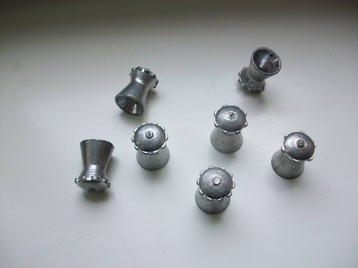 У меня такой формы пулелейка бреннекеподобная, сначала тоже не проливались ребра, но придумал приспособу на конфорку ставлю шайбу с нержавейки комфорка горит на минимальном огне на шайбу ставлю пулелейку она прогревается и заливаю свинец снимаю пулелейку трубным ключем маленьким разбирается она легко пулю выбиваю деревяной надставкой пуля выпадает легко. Вот фото, что у меня получается пули с хвостовиком вес 35,5-36 грамм, диаболо тоже 35-36 грамм, лью себе и друзьям.