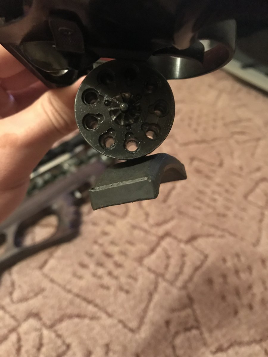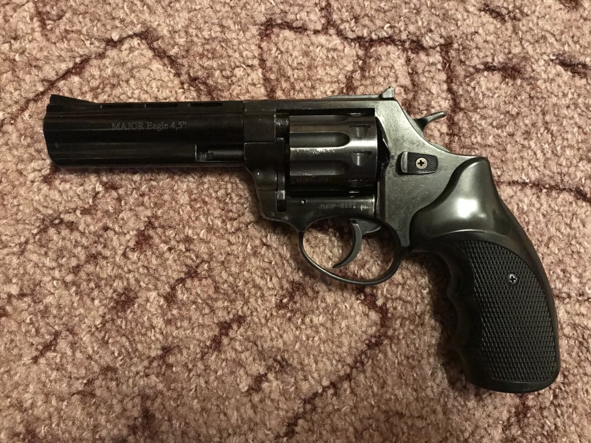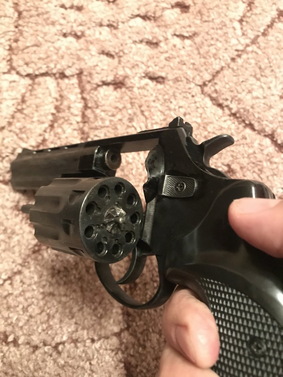 Револьвер в нормальном состоянии. Стреляет и с предварительным взводом и без. Ствол 4,5 дюйма. Барабан и ствол изготовлены из стали. Разрешение на покупку не требуется. В комплекте револьвер, чистка, кейс. Цена 1500грн