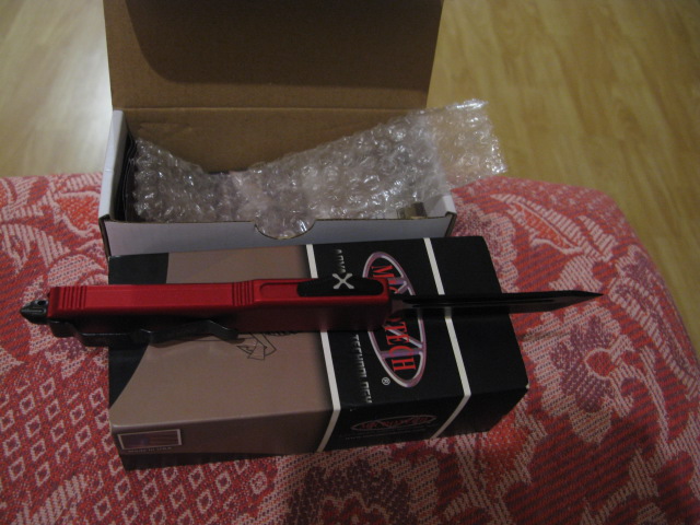 у продажу приємна репліка знайомого ножа microtech у доволі викликаючему кольорі. Ніж гарної якості, абсолютно новий. Лезо танто 8,8см, руків'я зі склобієм 14см. Ціна 1100 гривен. ТТХ з інтернету: Червона інтерпретація одного з найпопулярніших автоматичних ножів у світі – Ultratech від Майкротек. Ніж повністю відповідає моделі Blue CC, відмінності тільки в кольорі рукояті – у цьому випадку він темно-червоний, ближче до вишневого. Алюмінієва анодована рукоятка, клинок із сталі D2 з чорним покриттям, чорні гвинти та кліпса створюють гарне компонування кольору та дизайну. Як завжди, чітка механіка та оптимальні розміри Ультратека на першому місці серед переваг цієї фронталки Microtech Ultratech Red CC. Характеристики: Сталь: D2 Довжина клинка: 8.8 см Довжина ножа: 22.2 см Товщина обуху: 3.05 мм Матеріал рукояті: алюмінієвий сплав Кліпса: знімна, двостороння Вага ножа: 105 г