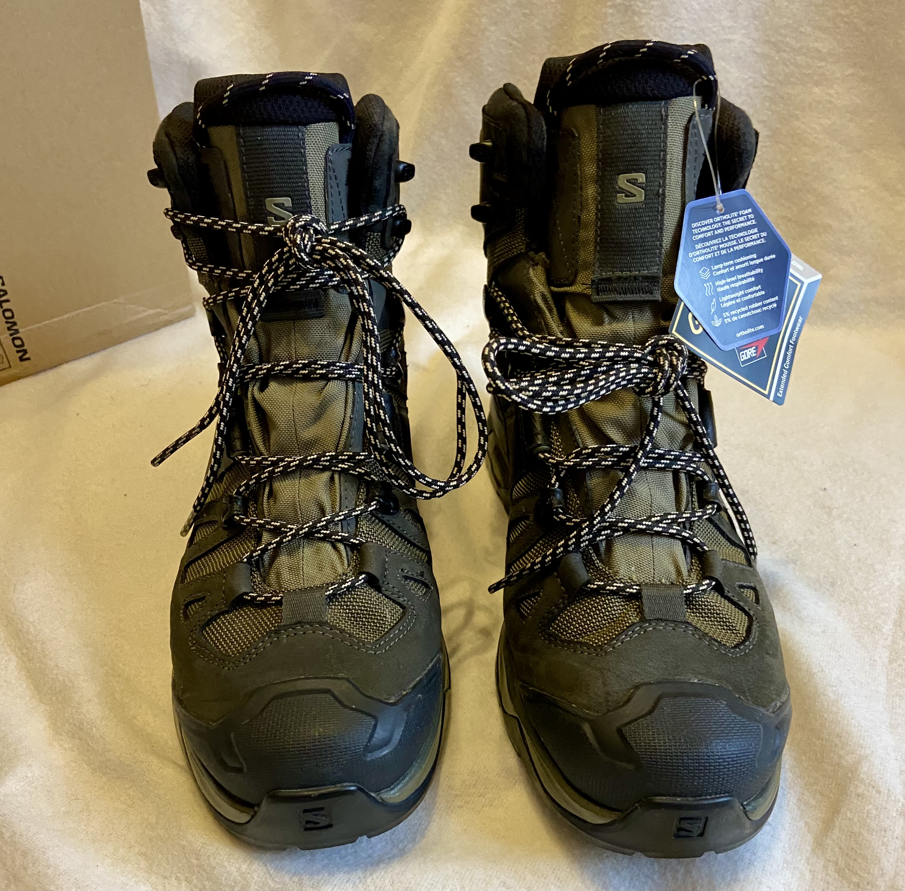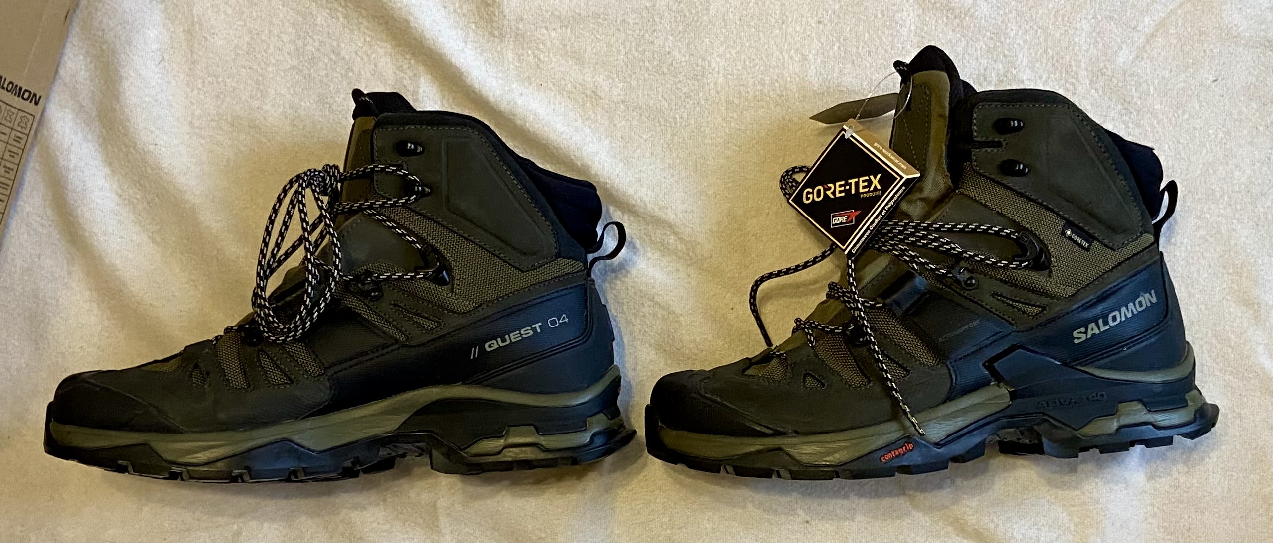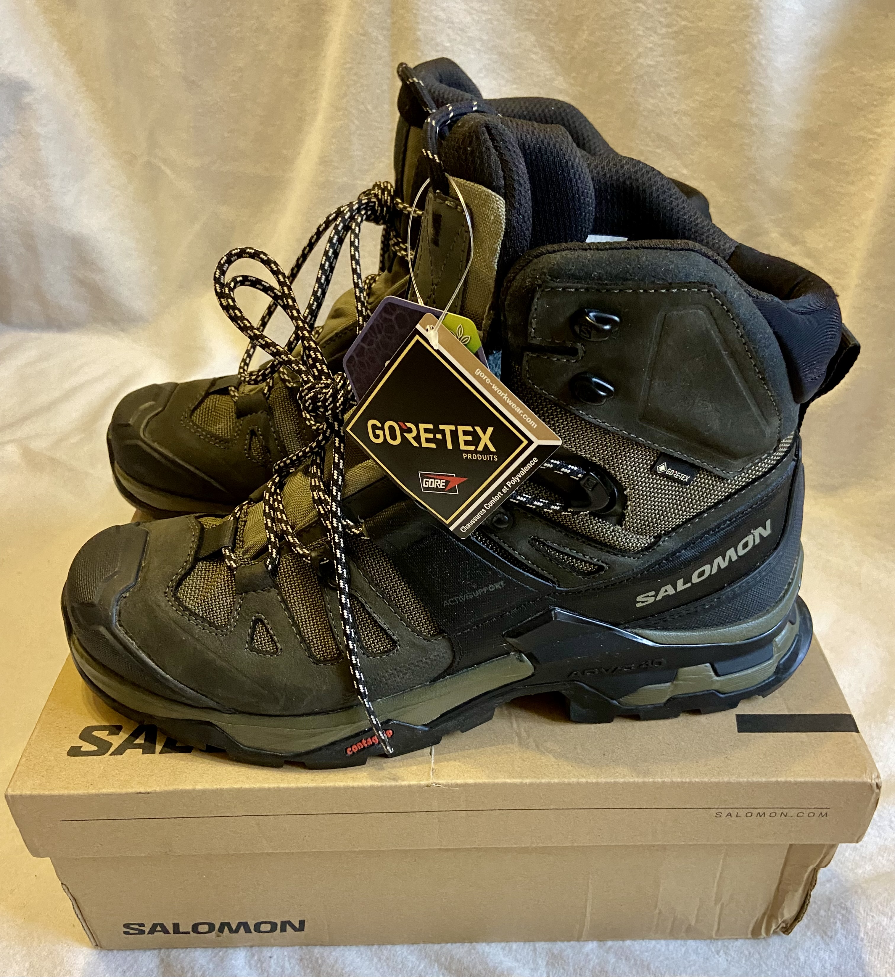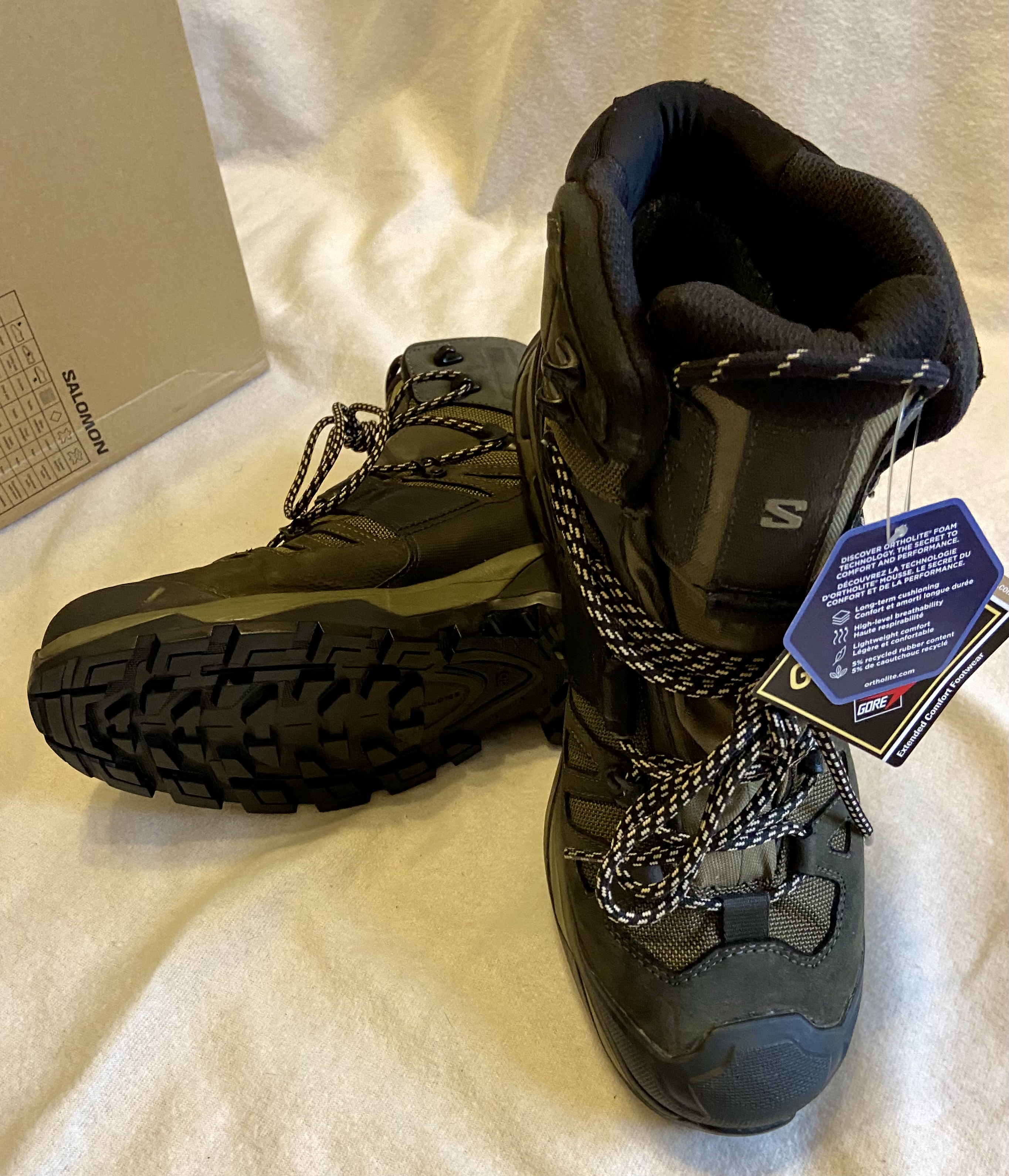 Нові ОРИГІНАЛ Черевики Salomon QUEST 4 GTX https://www.salomon.com/de-de/product/quest-4-gore-tex-lg4311/L41292500?sizeId=L41292500033 Color: Oliva night/Peat/Safari Size: EU44 2/3(US10,5M,28,5cm) Salomon Quest 4 GTX – надійні чоловічі черевики для тривалих експедицій та складних умов. Модель із оновленим шасі створює додаткову підтримку на будь-якому рельєфі, зберігаючи при цьому плавність кроку та чутливість суглобів. Черевики мають стабільність, відмінне зчеплення і водонепроникність, необхідні в будь-якій місцевості. Верх із водовідштовхувальним просоченням та мембрана Gore-Tex® надійно захищають ноги від намокання. Оновлена технологія ADV-C 4D Chassis™ гарантує високу стабільність положення стопи при використанні на найбільш складному рельєфі, гарантує гнучкість та легкий перекат, а також мінімізує ризик травм. Особливості: • підошва Contagrip® TD – ідеальне поєднання гумового складу та геометричного малюнка протектора для надійного зчеплення на вологих, сухих, твердих або пухких поверхнях. • технологія ADV-C 4D Chassis™ – частина підошви між зовнішнім та проміжним шаром. Забезпечує високу стабільність положення стопи, зберігає гнучкість та мінімізує ризик отримання травм на складному рельєфі. • водонепроникна та дихальна мембрана Gore-Tex® • верх черевиків з водовідштовхувальним просоченням захищає від намокання • високі черевики підтримують та надійно захищають кісточки • цільний язичок перешкоджає попаданню води, бруду та снігу • зносостійка підкладка • захист від бруду Mud Guard – захисний матеріал навколо основи черевика • синтетична захисна накладка на мисці та п'яті • петля на заднику дозволяє швидко надіти/зняти черевики • класичні шнурки із зручною системою шнурівки Найкраще підходить для: Багатоденних турів, трекінгу Амортизація: Середня Перепад висоти: 12 мм Підтримка стопи: Стабільна Вага на одиницю: 655 г Ширина: Звичайна/Стандартна Місцевість: Змішана місцевість, альпійська місцевість