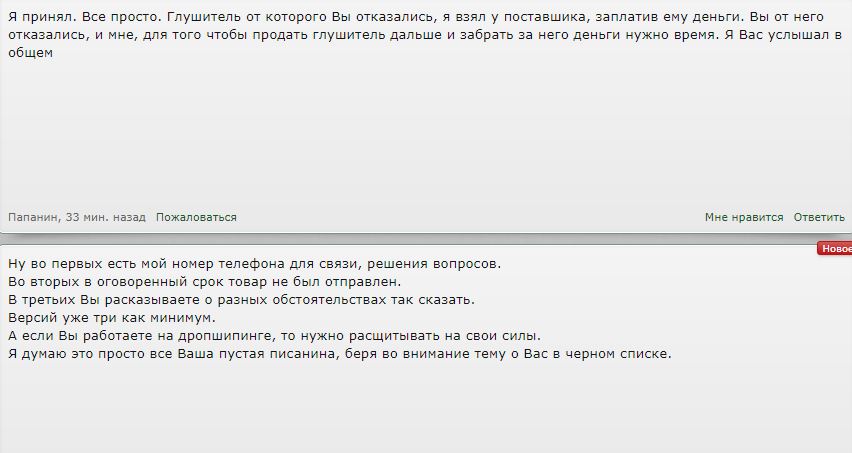 Приветствую. С продавцом связь держу. Ситуацию ему обьяснил. Быстро найти желающего на глушитель от которого он отказался не так то просто. Даже за 350 долл. Деньги будут возвращены покупателю в полном обьеме в течении трех дней. П. С. На каком основании мои личные данные выложены в открытый доступ? Я не выхожу на связь, не отвечаю на письма? Кидалово, как об этом заявляет продавец, с моей стороны это уже свершившийся факт? Я взял деньги и пропал? Только на прошлой неделе в результате похожих операций люди оставили положительные отзывы о сделках. Так откуда речь о мошенничестве?
