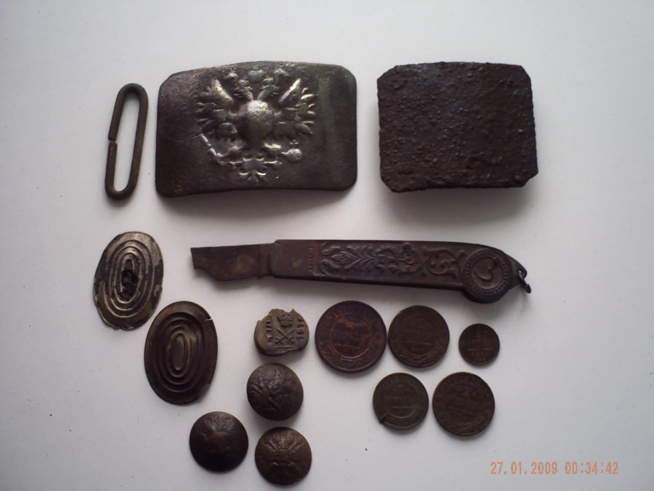 Небольшой отчет выхода по 1мв за полтора дня.Две пряжки одна ополченец вторая с орлом(после мойки оказалась сильно потертой),перочинный нож,две кокарды на одной след от пули или осколка,пару монет .Пуговици орел на пушках(одна супер вторая потертая)и орлик на якорях.И куча шрапнели и гильзача.