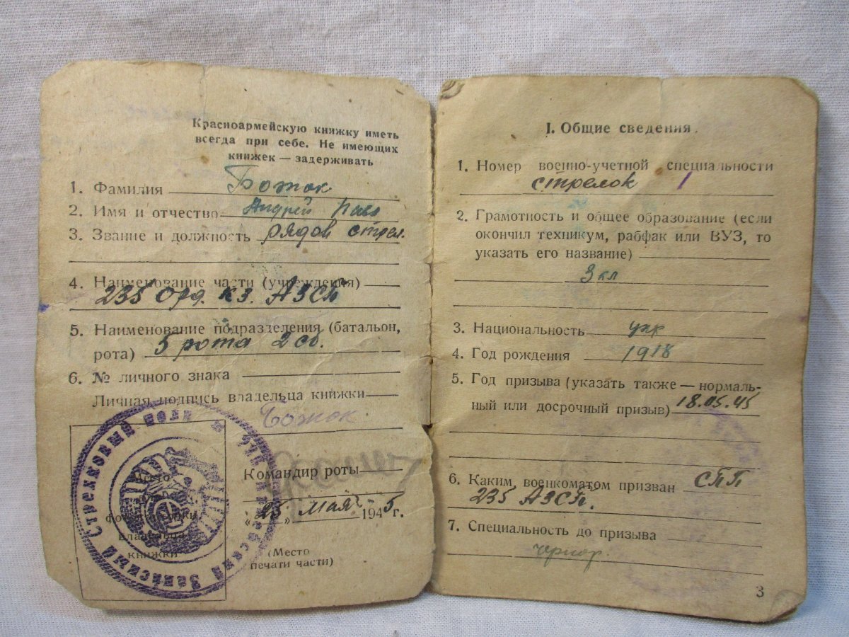 Здравствуйте. Мой дед, Божок Андрей Павлович, 1918 г.р. при жизни был не сильно разговорчив, так что практически о нем ничего не знаю. Недавно нашел его красноармейскую книжку, где указано, что в РККА он находился: