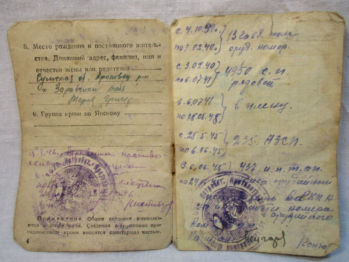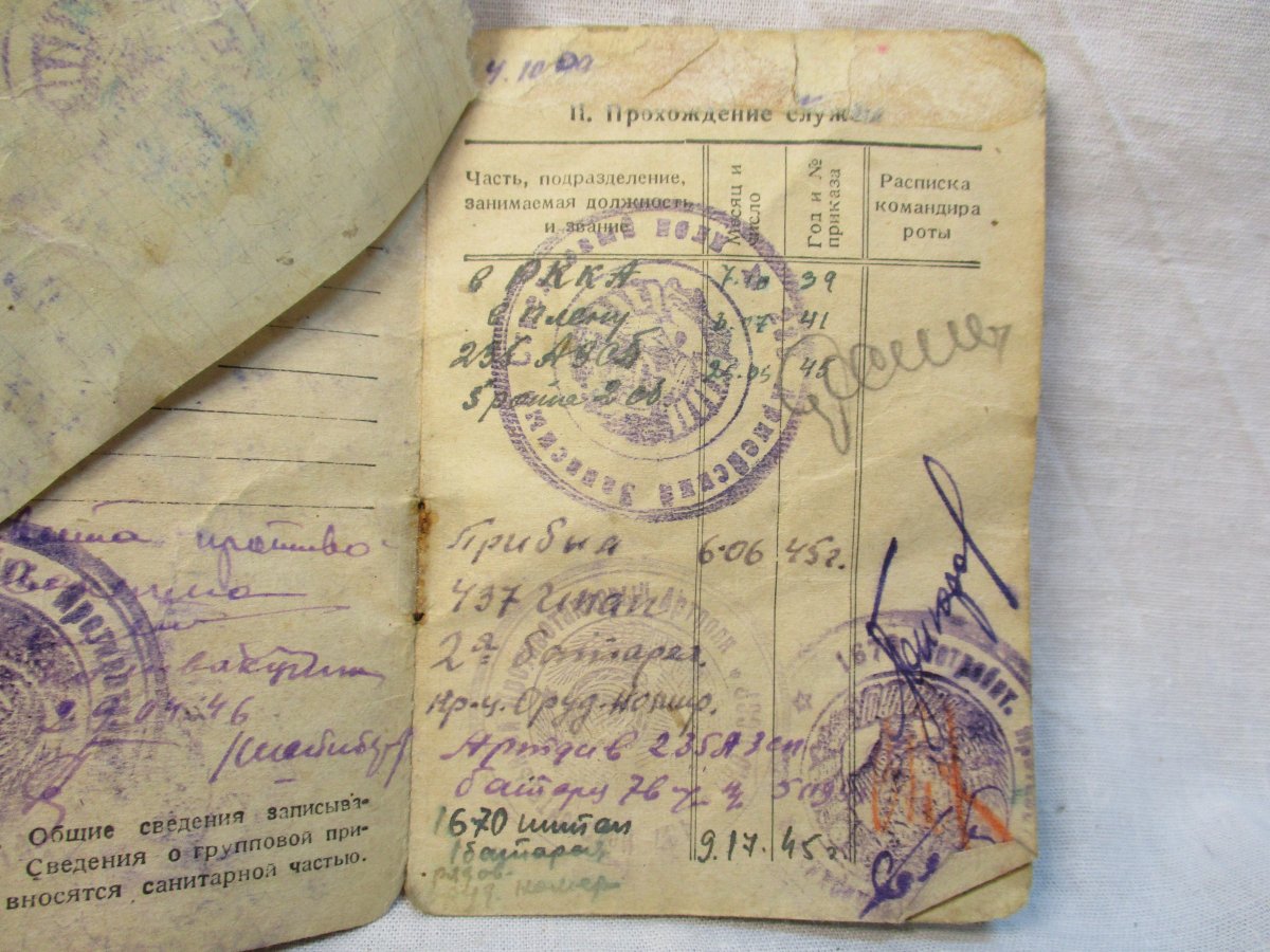 Здравствуйте. Вот, все таки разобрался с записью в армейской книжке (фото№4)- периодом с 03.02.1940 г. по 06.07.1941 г. - 49/50 СП рядовой. Получилось, что это 49 стрелковый полк 50 дивизия (по базе ОБД Мемориал в документе 1945 г ОШИБКА, там стоит 495 стрелковый полк. Если бы не найденная армейская книжка, то наверное до сих пор думал бы, что дед служил в 495 сп, а это совсем другая дивизия, армия и место.). С учетом правильной информации все стало на свои места и подтвердились некоторые слова деда. Теперь есть много новой информации по которой можно работать.