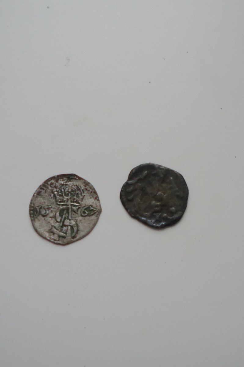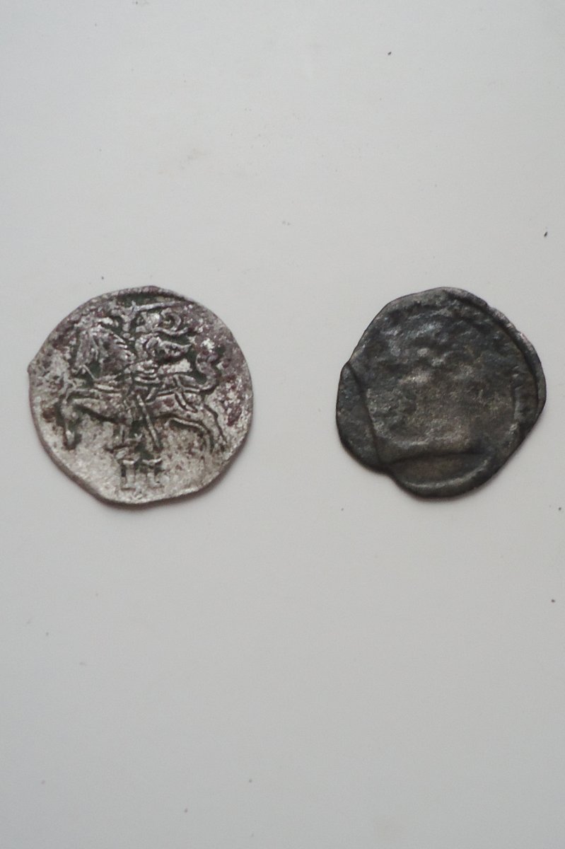 Левая монетка - литовский двуденарий 1567 года Сигизмунда II Августа, монетный двор г. Вильно (нынешний Вильнюс).