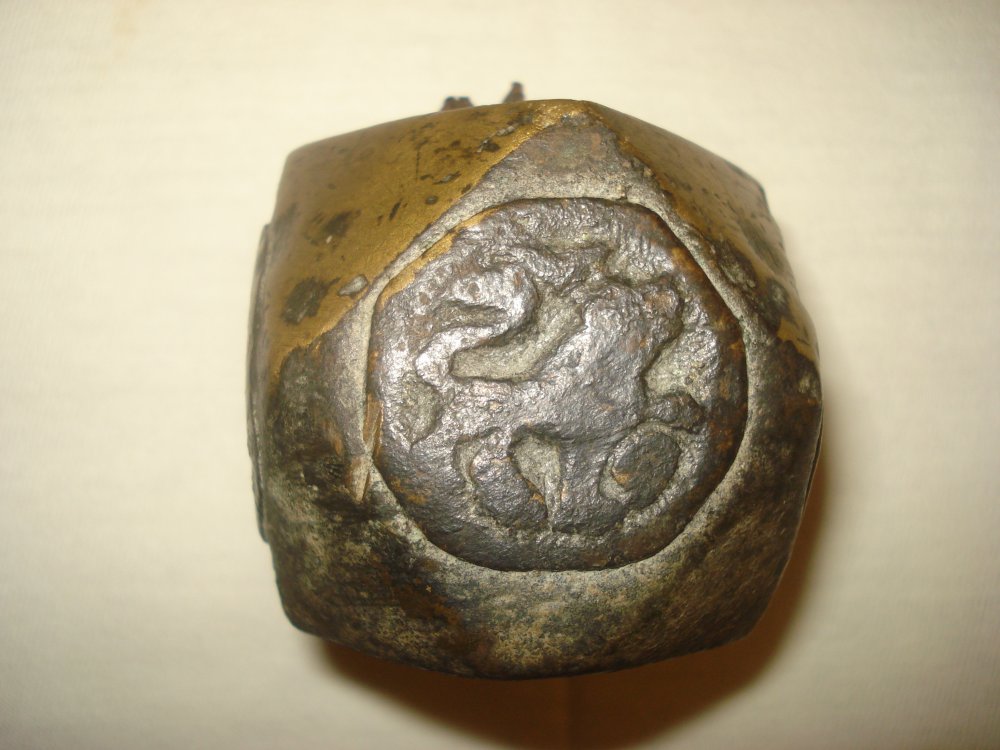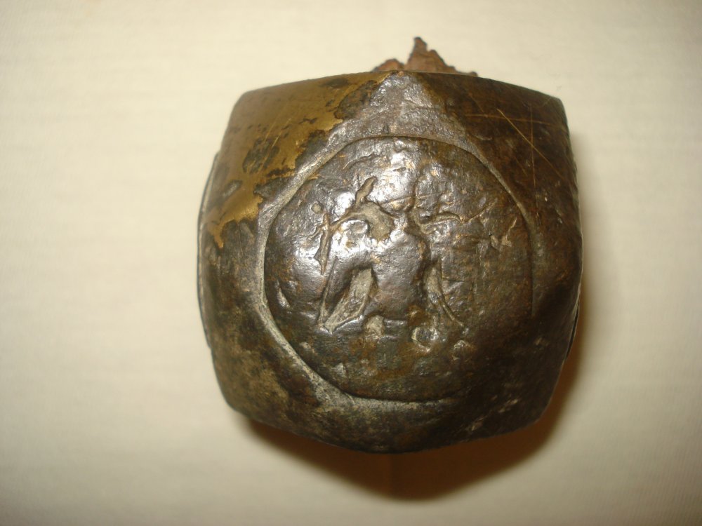 Предмет у формі куба,із зрізаними гранями.Матеріал, скоріш за все-бронза. Знайдено при перекопуванні городу в Харківській обл.Видно залишки деревяної ручки.Прошу висловити свої думки.