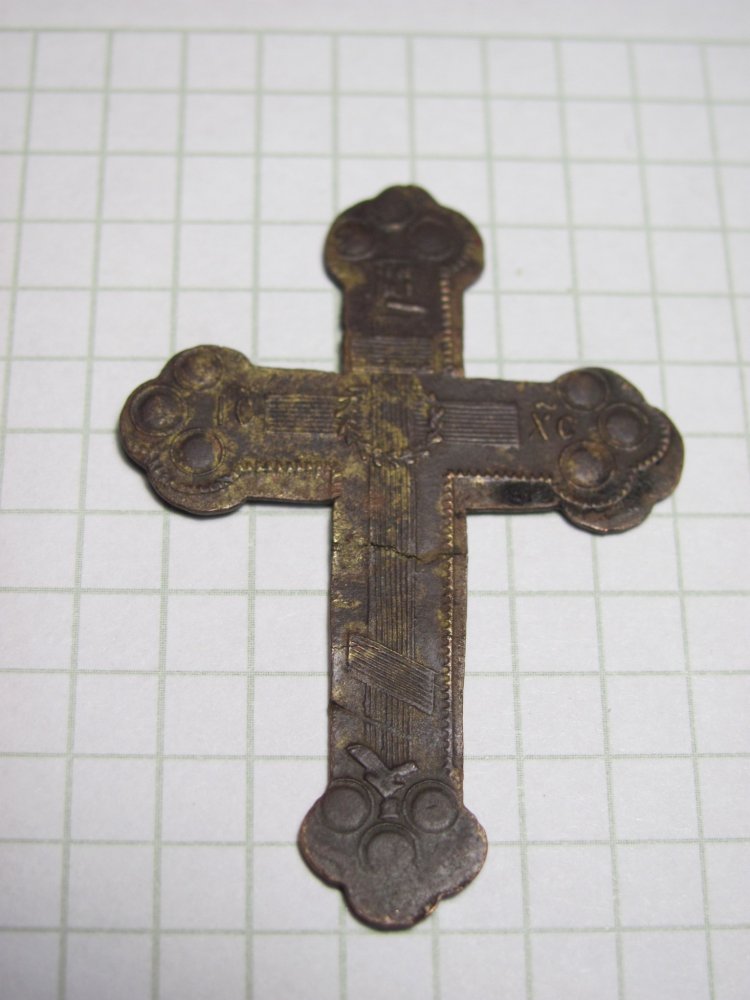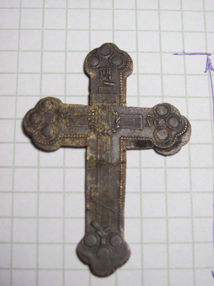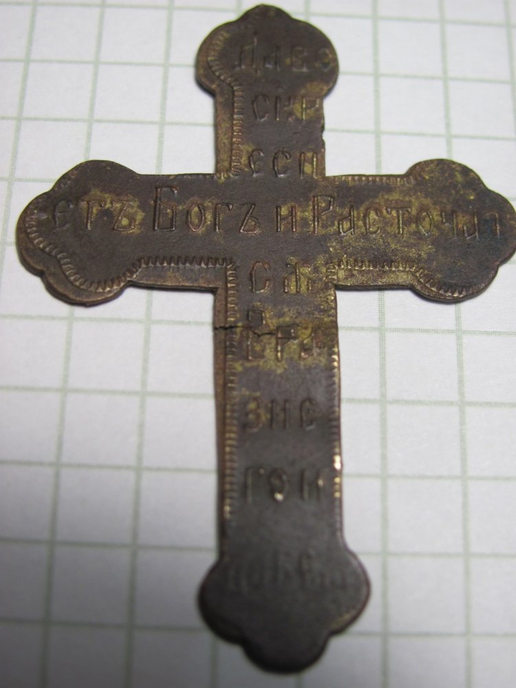 Уважаемые камрады! Помогите определить крестик. Его историю по возможности, век, ценность и т.д. Сам гуглил - ничего подобного не находил. Размеры 5см на 3.5см. Медь. Найден в запорожской области. На обратной стороне крестика начало молитвы Честному Кресту : "Да воскреснет бог, и расточатся врази его..." Заранее благодарен за оказанную помощь