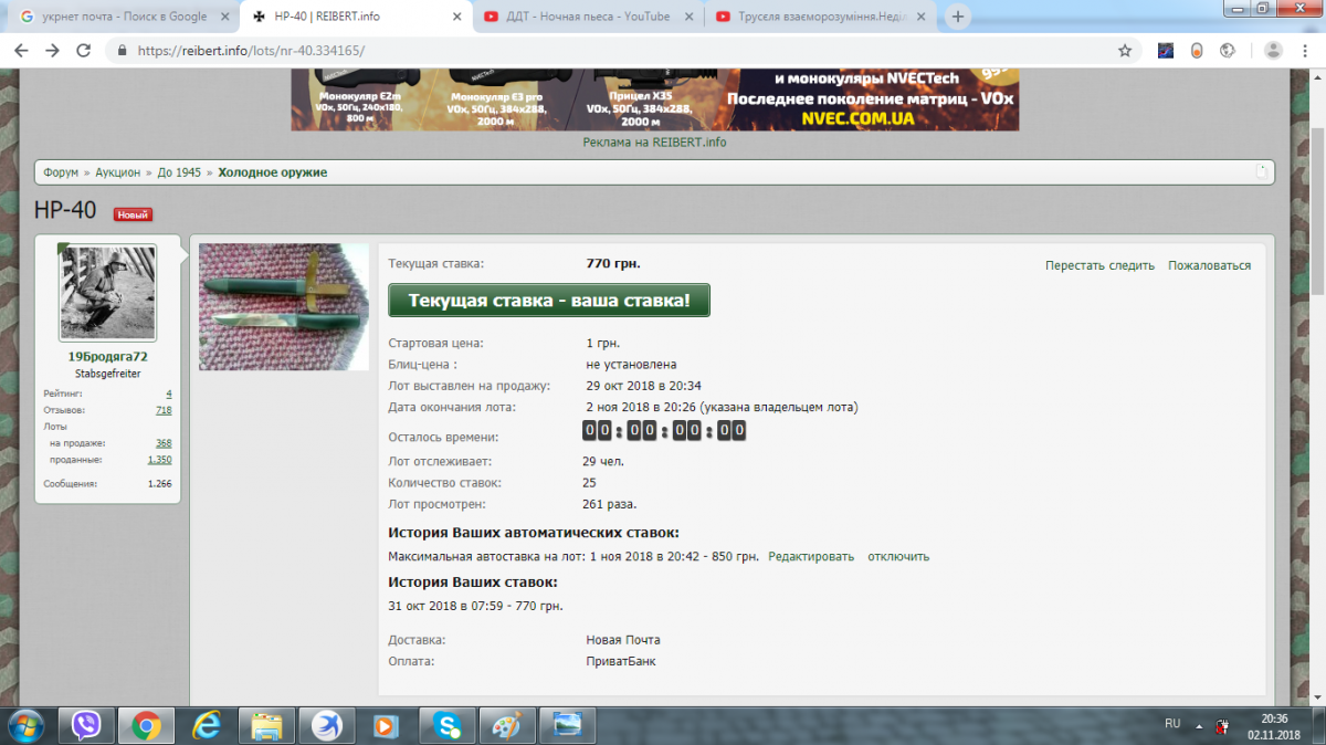 Добрый день! Я принимал участие в аукционе, где продавался новодел Нр-40. Дата окончания лота, указана продавцом: 2 ноября 2018 года 20-26 31 октября 2018 года в 7-59, я установил автоматическую ставку в 770 гривен. 01 ноября 2018 года в 20-42, желая гарантировано выиграть выставленный лот, я поднял ставку до 850 гривен (скрин 1). 2 ноября 2018 года в 20-39 текущей ставкой была моя ставка – 770 гривен (скрин 2). Но уже в 20-42 информация сайта изменилась. Как выяснилось, лот выиграл пользователь с максимальной ставкой 1180 (скрин 3). Как такое произошло, почему своевременно на сайт не выводится информация!? Я был готов заплатить более высокую цену!