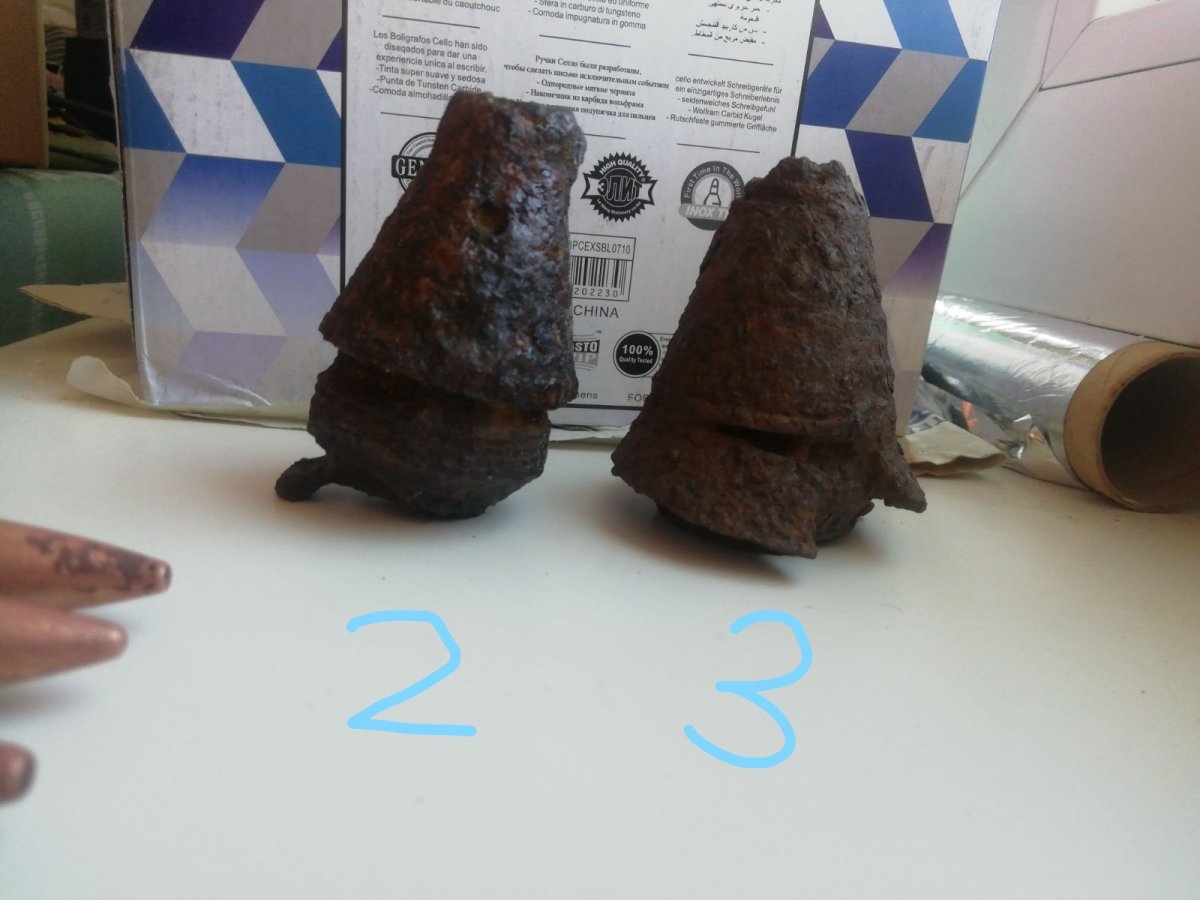 Что б не плодить тем, вот еще находочки. Кто что думает? Был наконечник, но рассыпался. Длина 57мм. Диаметр 18...20мм сильная корозия на дает точно померить, По пояску 20,6мм По фото напоминает Швак 20 мм (бронебойный) с бакелитовым наконечником