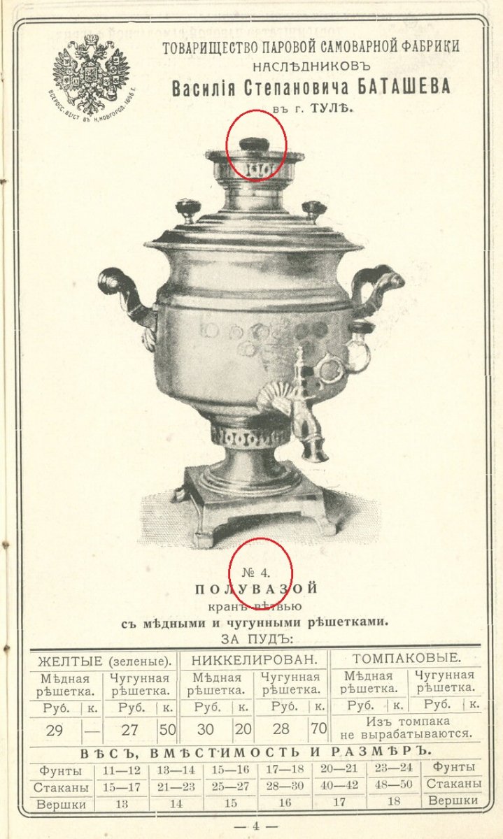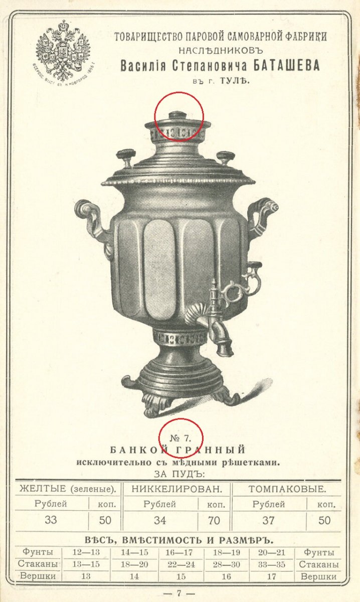 логічно припустити, що № 6 - 50 мм, тобто розміри йдуть з шагом у 5 мм. на основі цього можна зробити висновок, що номер на кришках це номер товару у прейскуранті виробника. повернемось до наших самоварів. )