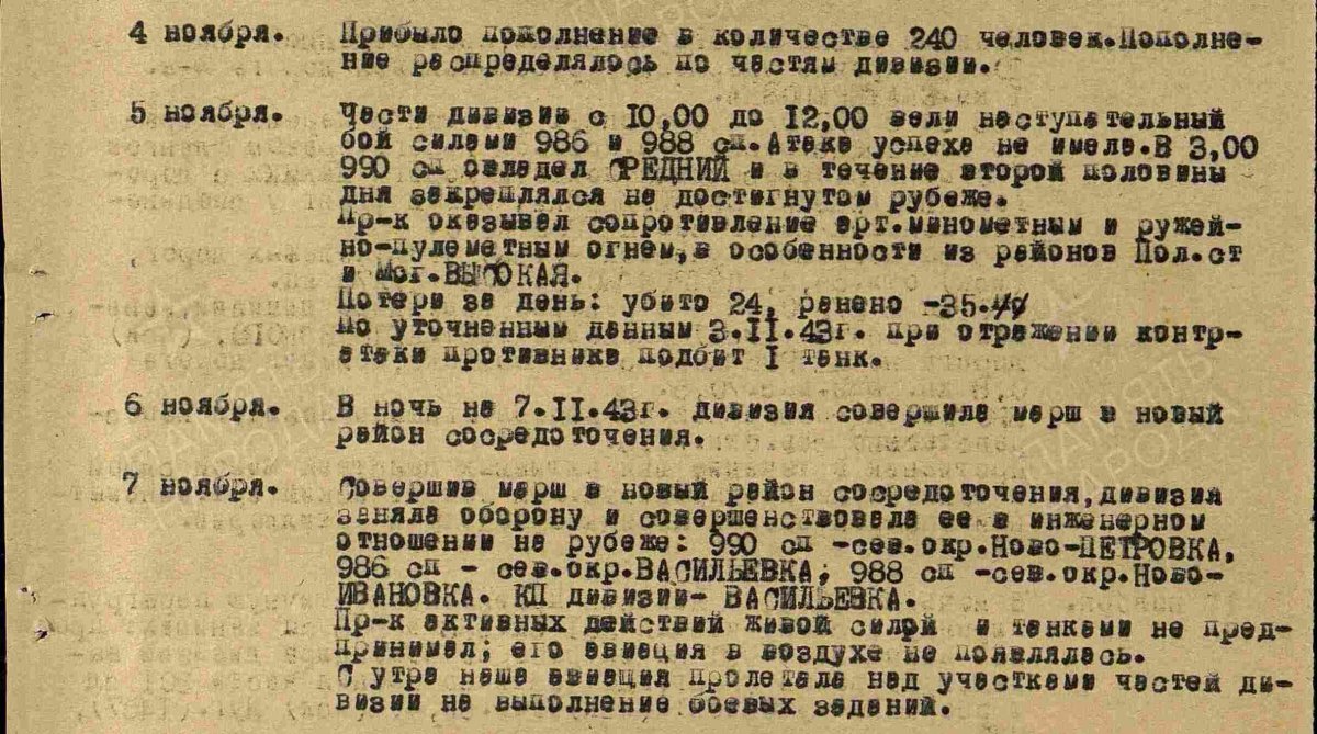 Доброго! Судя по донесению, он воевал в составе 986 стрелкового полка 230 сд (в донесении указана схема захоронения № 24). https://obd-memorial.ru/html/info.htm?id=55471358 Вот выписка из ЖБД 230 сд за 05.11.1943 г., накануне, 04.11., в дивизию тоже прибыло пополнение (240 чел.) https://pamyat-naroda.ru/documents/view/?id=135635415&backurl=division\230 сд::begin_date\11.10.1943::end_date\13.10.1943::use_main_string\true::group\all::types\opersvodki:rasporyajeniyatchetieregovori:jbd:direktivirikaziosnatovleniya:dokladi:raporti:doneseniya:svedeniyalanilani_operaciy:karti:shemi:spravki:drugie&date_from=11.10.1943&date_to=13.10.1943&static_hash=5191187f676acb4e5f6d31e8d00e5597v5 Для того, чтобы внести изменения в ОБД Мемориал, Вам нужно зарегистрироваться на сайте, после регистрации войти в учетную запись. Будет доступна кнопка "Добавить доп. информацию +". Чтобы увековечить его на братке, имхо, нужно обращаться в сельсовет. С уважением,
