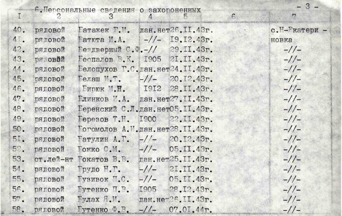 И еще. Жена Бережного 100% получила похоронку, пусть даже и с ошибкой в фамилии. Этому подтверждение - 1) она его не искала 2) на хуторе врядли было загадкой найти адресата с такими данными, жена там проживала, адрес свежий, его призвали после освобождения родного хутора в октябре 1943 за месяц до гибели. Фамилия Беренской Имя Степан Отчество Лукьянович Дата рождения: 1896 3) То , что он увековечен (пусть и с ошибкой) на братской могиле в списке говорит о том, что похоронка в Ореховский РВК дошла. 4) Орехов освобожден 19 сентября 1943 года, т.е. за почти 2 месяца до гибели Бережного (05.11.1943). Похоронку в полку выписали намного позже и шла она минимум пару недель.
