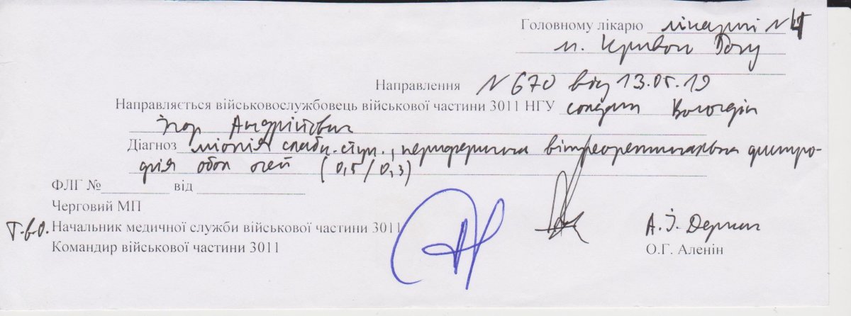 Приветствую друзья! Сложилась ситуация что вынуждены с супругой обратится к Вам за помощью в лечении нашего старшего сына, бойца 21-й бригады Вологдина Игоря. Решив посвятить себя армии Игорь два года отучился в военном лицее после чего пошел служить по контракту. После ротации из зоны ООС написал рапорт на поступление в академию на командно-штабной факультет. При прохождении медкомиссии обнаружились проблемы со зрением обоих глаз. Врачи диагностировали миопию и отслоение сетчатки, зрение стремительно падало. Израсходовав все финансы, смогли оплатить ему первую операцию. Теперь предстоит вторая, после чего реабилитация, но пока стала проблема в финансах. Будем благодарны за оказанную помощь - карта Приватбанка 5168 7422 3098 1494 Вологдин Игорь. P.S.- Размещение темы согласовано с Артемом.