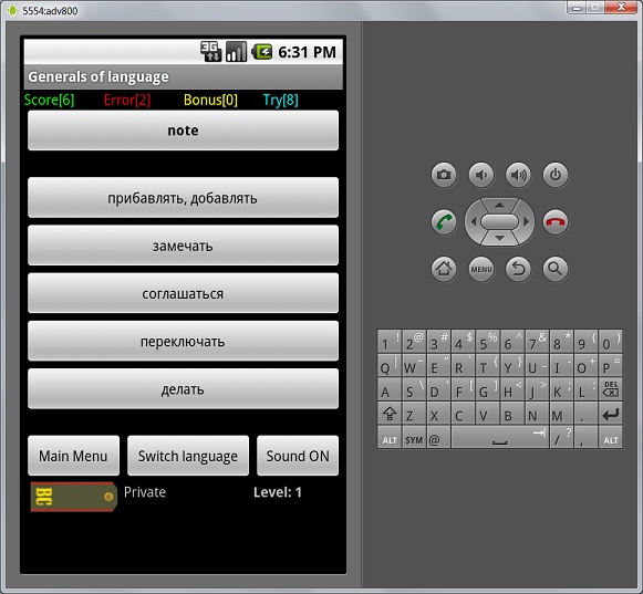 В качестве обучения работы на java под андроид, наваял маленькую программку под Android. Предстоит в будущем работа на java, тренируюсь. с Java раньше не сталкивался. Умею только Delphi, C#, Abap. Программа как бы в в бете. На мой тест под эмулятором работает все что я хотел, только не работает меню Options. Нет никаких настроек.Пока нет. Что делает программа. Программа это простейшая "запоминалка" различных слов на разных языках. Но с игровым моментом.Можно использовать свои словари. Русско-английские, Англо-немецкие. Любые которые вы себе создадите сами. Режим простой. Вы загружаете файл со словарем, программа случайным образом выдает 1 вопрос и 5 вариантов ответов. Вы должны угадывать. Игровой момент состоит в том что за серию угаданных слов вы получаете новое звание!!! Военное звание. За неправильные ответы Вас лишают звания. Ваша задача дойти до маршала. 20 левелов. Попробуйте на файле 14 000 слов дойти до маршала .. если вы не спец конечно в английском. В комплекте с программой идут 2а словаря. Один примерно на 300 английских глаголов.Второй на 14 000 слов русско-английских и наоборот. Каждый сможет себе сам создать дополнительные словари. Формат простой. Открыв файлы в комплекте с программой Вы поймете что за формат. Учитывая что Android это линукс а там везде кодировка Unicode. Программа настроена загружать файлы в Windows кодировке. Потом я сделаю опции где можно запускать в любой кодировке. Файлы уроков для себя можно создавать в обычном winдовом notepad. Кстати программа может может менять в процессе обучения на каком языке вопрос на каком ответы. То-есть переключать английский-русский русско английский. Теперь о главном. Вся проблема в том что программа написана на эмуляторе и у меня нет сейчас под рукой устройства на android. И у друзей нет. Будет устройство ближайшее через пару недель. Просто хочу узнать. Она вообще запускаться и работать будет на андроид устройстве. Программа никаких пермишенов на звонки на смс и т д не имеет. Безопасно. сцылка на программу http://rapidshare.com/files/411435338/GLanguage.rar Как работать. 1.Инсталлируете программу на Ваше устройство. 2.на SDкарту переписываете файлы с уроками в каталог GL в корне. (Внешние файлы грузятся только с SD карты для безопасности и не лазанья внутрь служебных каталогов) 3. Загружаете программу и выбираете нужный файл с разрешением .gl. 4.Запуск.. там все понятно дальше будет. Что нужно. Программа разрабатываться под. Android2.0 Программа тестировалась на экране 800x480. Программа только под портретный режим. Теоретически должна работать под ниже разрешение, но не знаю как это будет.