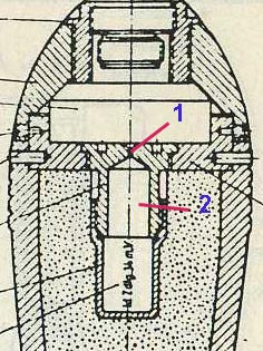 Ответ: Прыгающая мина Эта "заглушке боевого заряда" с маленьким отверстием и есть газодинамический замедлитель. После сработки вышибного, РАСКАЛЕННЫЕ газы через это маленькое отверстие (.1) начинают заполнять камеру замедлителя (.2), по заполнении которой срабатывает kl.Zdlg.34. За время затраченное на заполнение камеры (.2), мина успевает "подпрыгнуть" на заданную высоту.