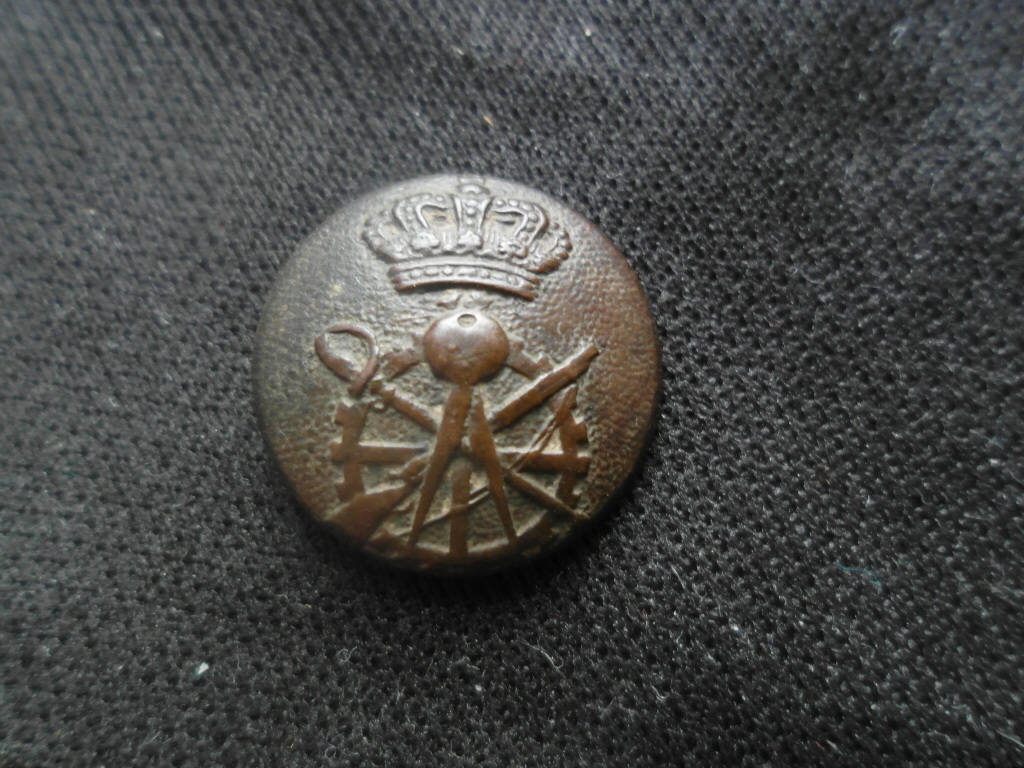 Могу ошибаться, но корона вроде бы испанская, типа вот такой: https://ru.wikipedia.org/wiki/Королевская_корона_Испании По набору предметов (сабля, винтовка, шестеренка, циркуль?) предположил бы принадлежность пуговицы военным топографам, геодезистам, картографам, может каким управленцам-снабженцам?.. Извиняюсь за мнение дилетанта, - подождем специалистов. Честь имею!