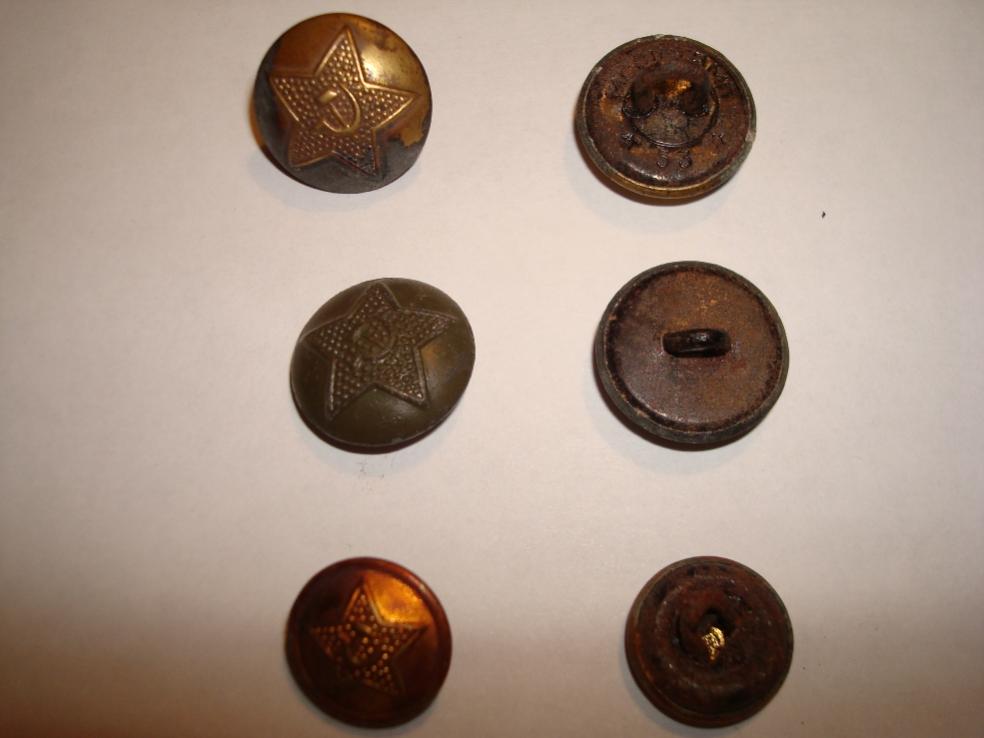 1. Погонная пуговица обр. 1946 для повседневной и парадной формы одежды. Она же - "бочонок". У нас на клубе - до 100-120 рублей доходило. 2. То же самое, но для полевой формы. Встречается реже 3. Явно гимнастёрочная, но период определить затрудняюсь