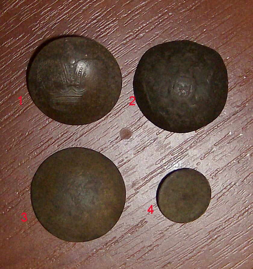 Ответ: Пуговицы Вот пуговицы, которые попались за сезон. Нужна ваша помощь в определении 4х пуговиц на втором фото. 1. Корона 2. Герб России (двухглавый орел) 3. На обратной стороне имеет надпись: "БУХЪ. Buch" - вверху, "2.Сортъ. S.PETERSBURG" - внизу и посередине два орла. 4. на обратной стороне имеет надпись *BIR MIИ* звезды и буквы в оригинале