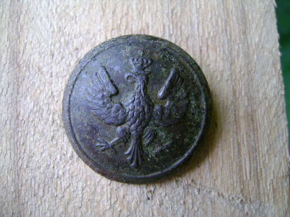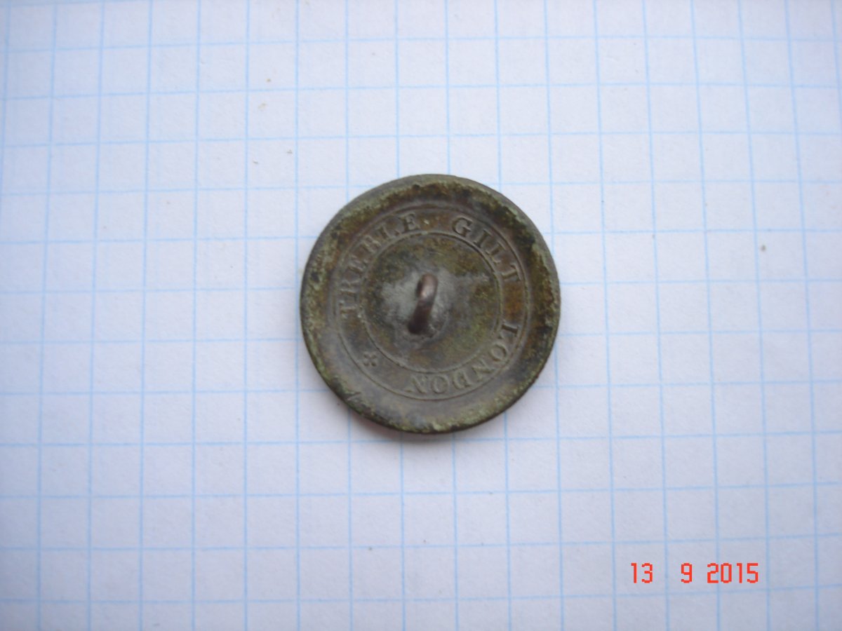 Брачная ливрейная пуговица. То есть два дворянских рода решили поженить детей. По этому поводу заказали партию пуговиц, на которых изображены гербы обоих родов.