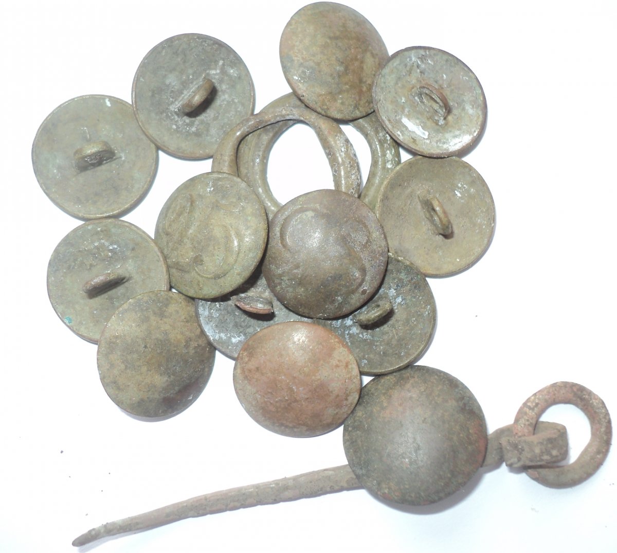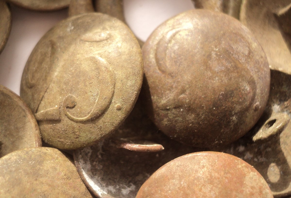 Здравствуйте уважаемые форумчане. Выскочило вчера с одной ямки 12 пуговиц и 2 бляшки.( 10 из которых лысухи с клеймом на обороте ИМ и одна ПЛ) В невдалеке нашел большую гренадку и протравничек для трубки или пистоля (а по одной из версий казацкая вилка) Интересно мнение камрадов, могли ли на одном кителе быть пуговицы с обозначением разных полков, и бляшки применялись ли на кителе? Каких времен девайсы? Буду признателен за внимание к теме.