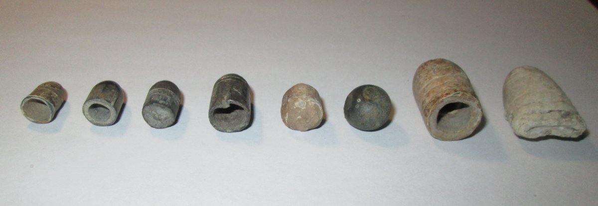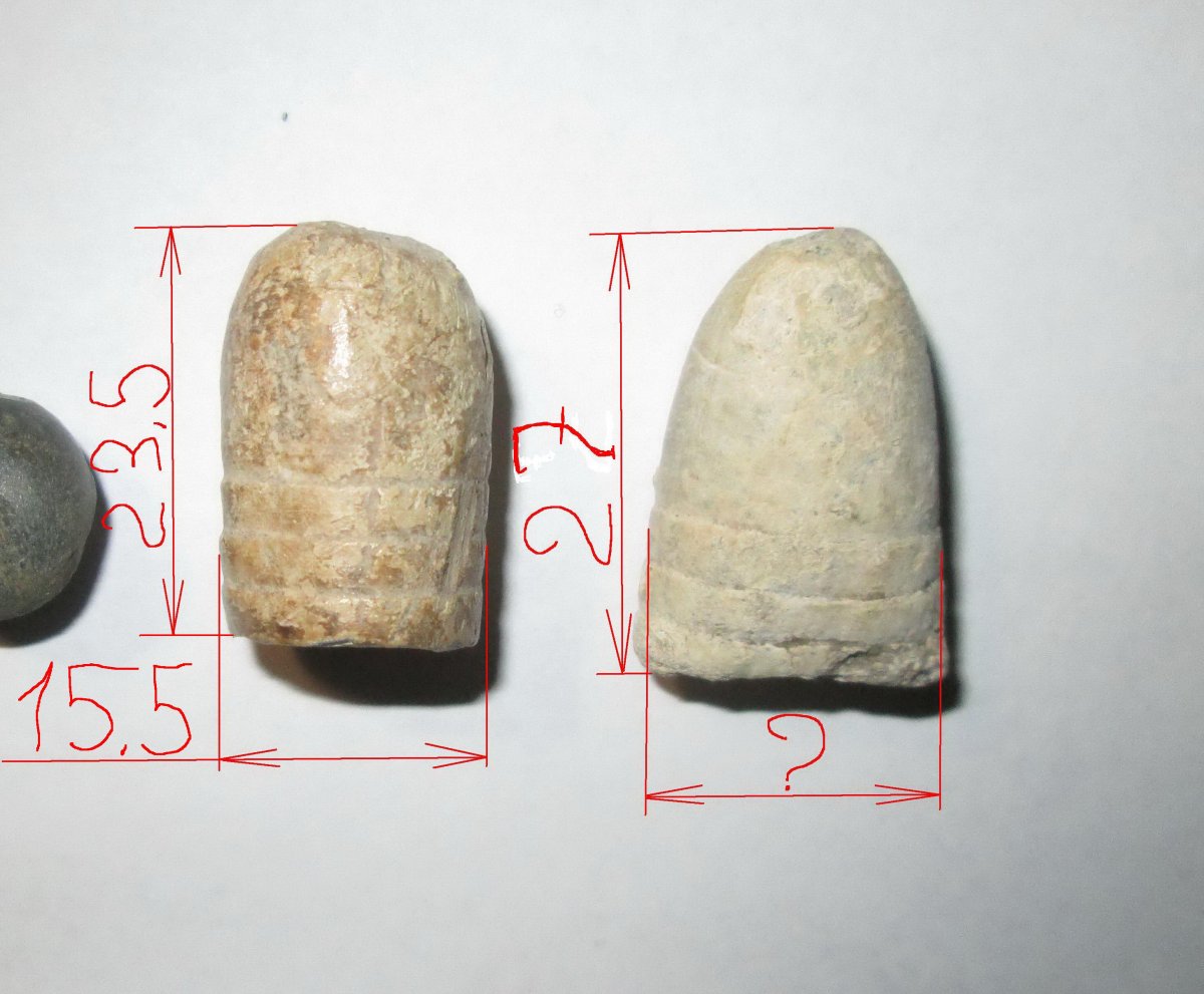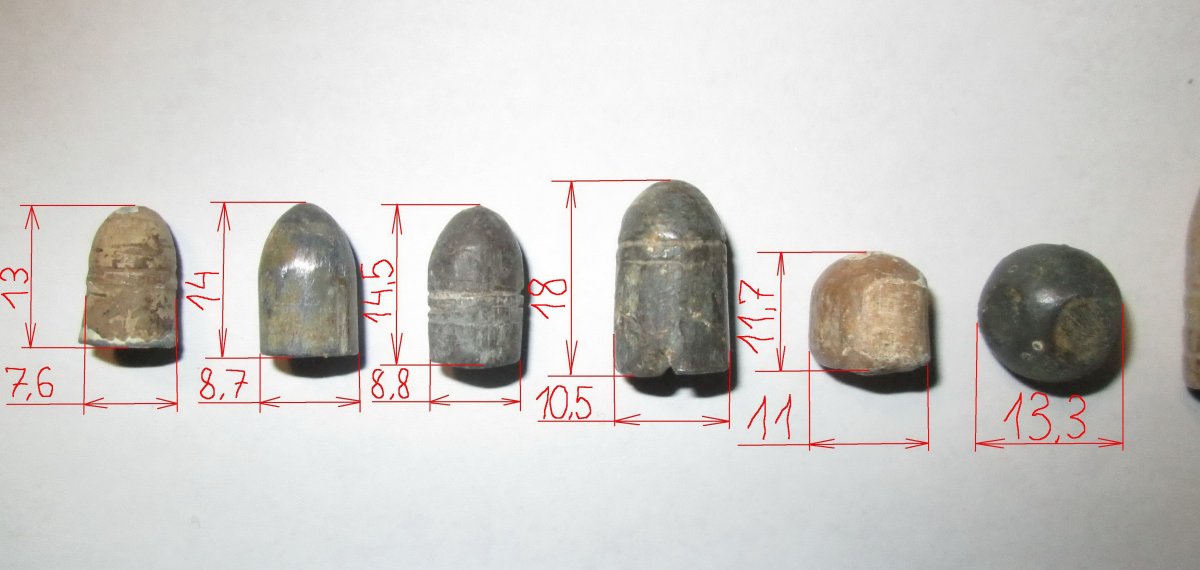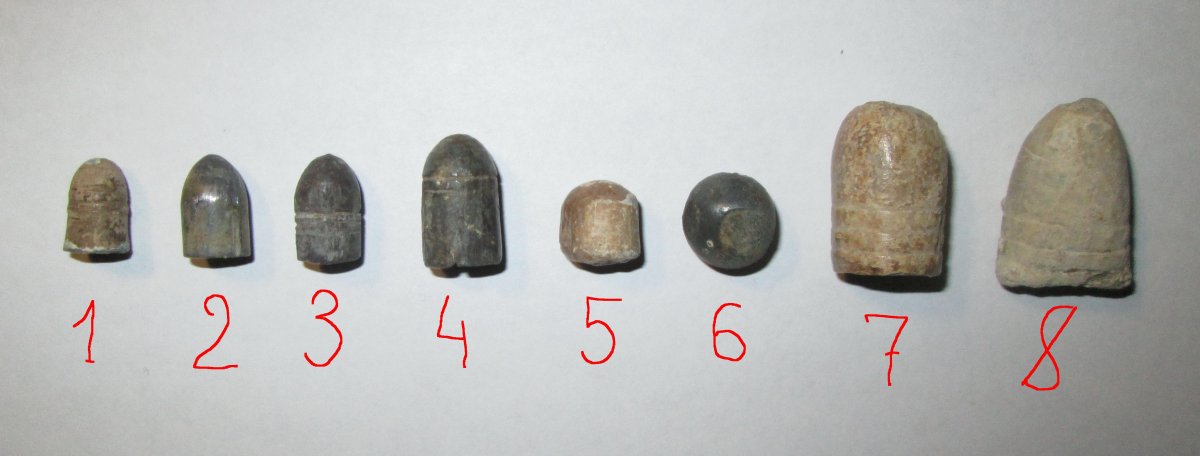 Предположу свою версию,если не прав просьба поправить: №1- .32 Smith & Wesson. №2,3- .38 Smith & Wesson ,разных производителей. №4- 4,2 линии Smith & Wesson. №5- что-то дульно зарядное,нарезное. №6- сферическая английская,револьверная 1854-56гг. №7,8- ??? 6 линий КРНКА(1869г) или 6 линий Вельтищева или 6 линий Минье...