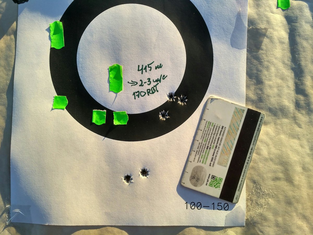 Я тут 220 гранн решил из 300всм погонят. Погода мерзкая: мелкий дождь и туман. Проверил нижнюю полку (790-810) Потом взял на 850-855мс для 220trbt. Таки неплохо. Ней пальнул на 415. Оправдываться не буду, но можно лучше. Редкие занятия стрельбой дают о себе знать. Как бы не плохо, как для магнума (все группы менее 0.5моа), но маемо шо маемо. Зато честно Условия такие:
