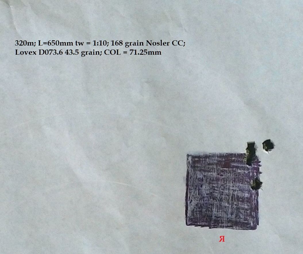 квадратик примерно 4,5*4,5см , но не более 5*5см 320м - кратность на лимбе прицела 7,5х и 4 выстрела... еще бы добиться такой же кучности от наших украинских пуль на Ловексе - я был бы счастлив.
