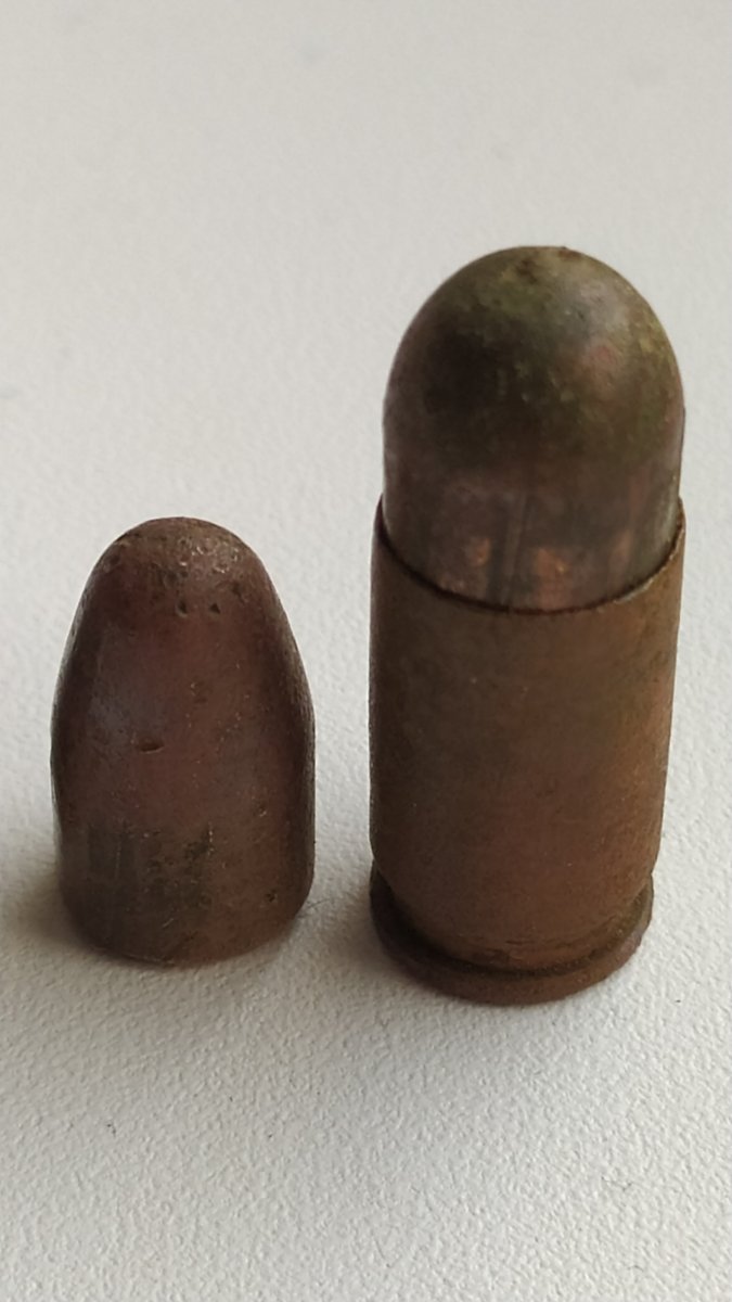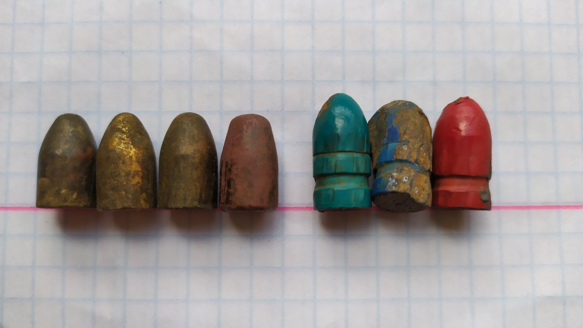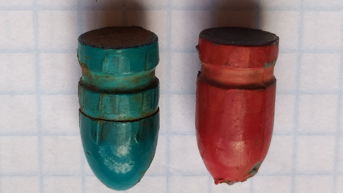 Здравствуйте! Попались в лесу такие крашеные пули. Примерно 9 мм (мерял линейкой ). С чего стреляли ? рядом пули 9мм пара, найдены там же.