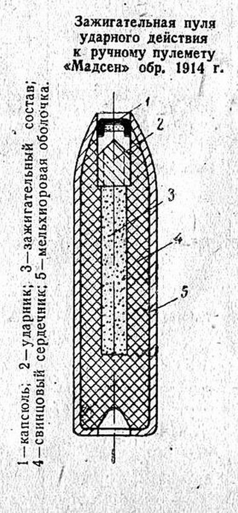 Для справки : их (таких) было вроде как две : "...Поскольку при стрельбе по целям, имевшим прочные стенки, было желательно несколько замедленное срабатывание пули, капсюль несколько утапливался в канал, высверленный в пуле. Если же огонь велся по тонкостенным аэростатам, необходимо было мгновенное действие – капсюль устанавливался сверху, над каналом, не утапливаясь..." к.ц.