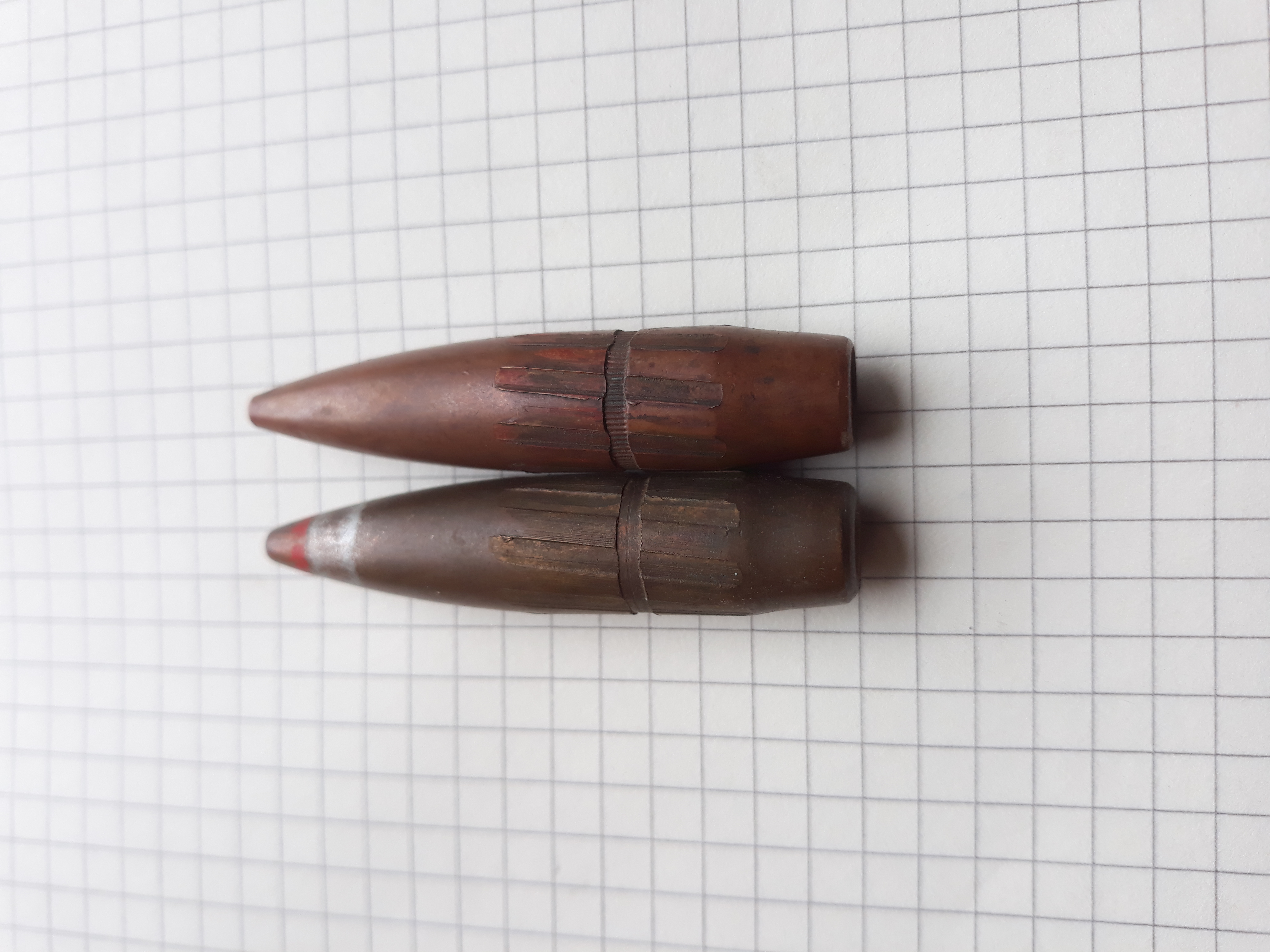Точно, признаю свою ошибку - пуля современная. Как говорится "где были мои глаза?" - у самого есть ее "родная сестра" после ночных налетов (на фото). Такая же донная часть (серый металл и точечные вдавленности), такая же каннелюра. И оболочка - латунь или томпак.